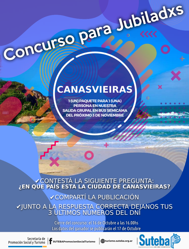 La Secretaría de Promoción Social / Turismo del Sindicato Unificado de Trabajadores de la Educación de Buenos Aires (en adelante "El Organizador") invita a las personas jubiladas que estén afiliadas al Sindicato a participar de este concurso por 1 (paquete) completo para 1 (una) persona en nuestra salida grupal a Canasvieiras del 3 de noviembre de 2019.