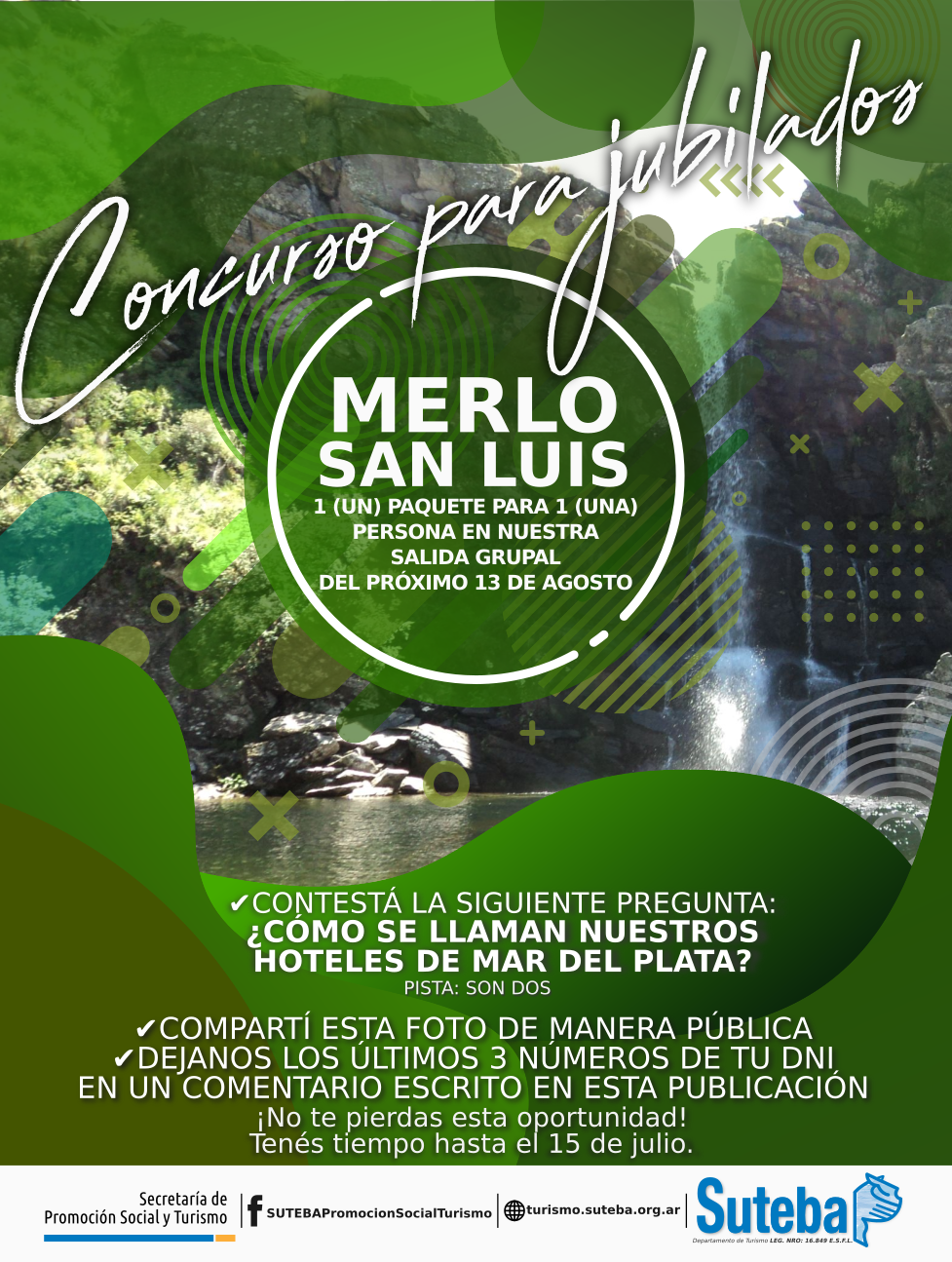 La Secretaría de Promoción Social / Turismo del Sindicato Unificado de Trabajadores de la Educación de Buenos Aires (en adelante "El Organizador") invita a las personas jubiladas que estén afiliadas al Sindicato a participar de este concurso por 1 (paquete) completo para 1 (una) persona en nuestra salida grupal a Merlo del 13 de agosto de 2019.