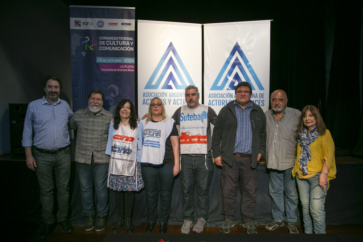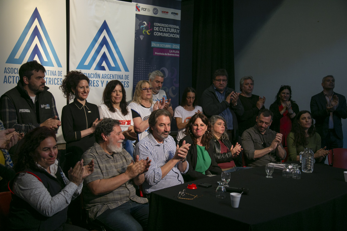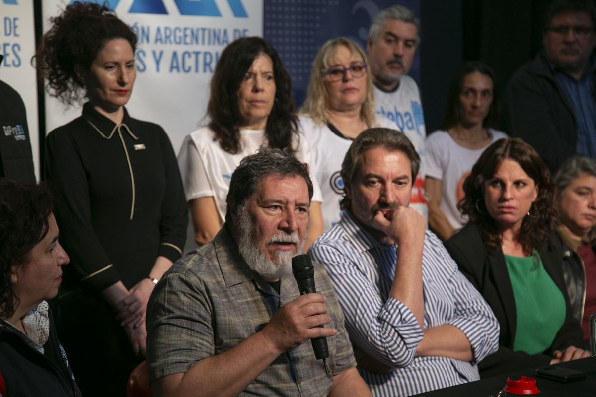 La conferencia se realizó en la sede de la Asociación Argentina de Actrices y Actores y contó con la presencia de representantes de la Asociación, de las tres Centrales, de la Intersindical RADAR y de Legisladorxs.