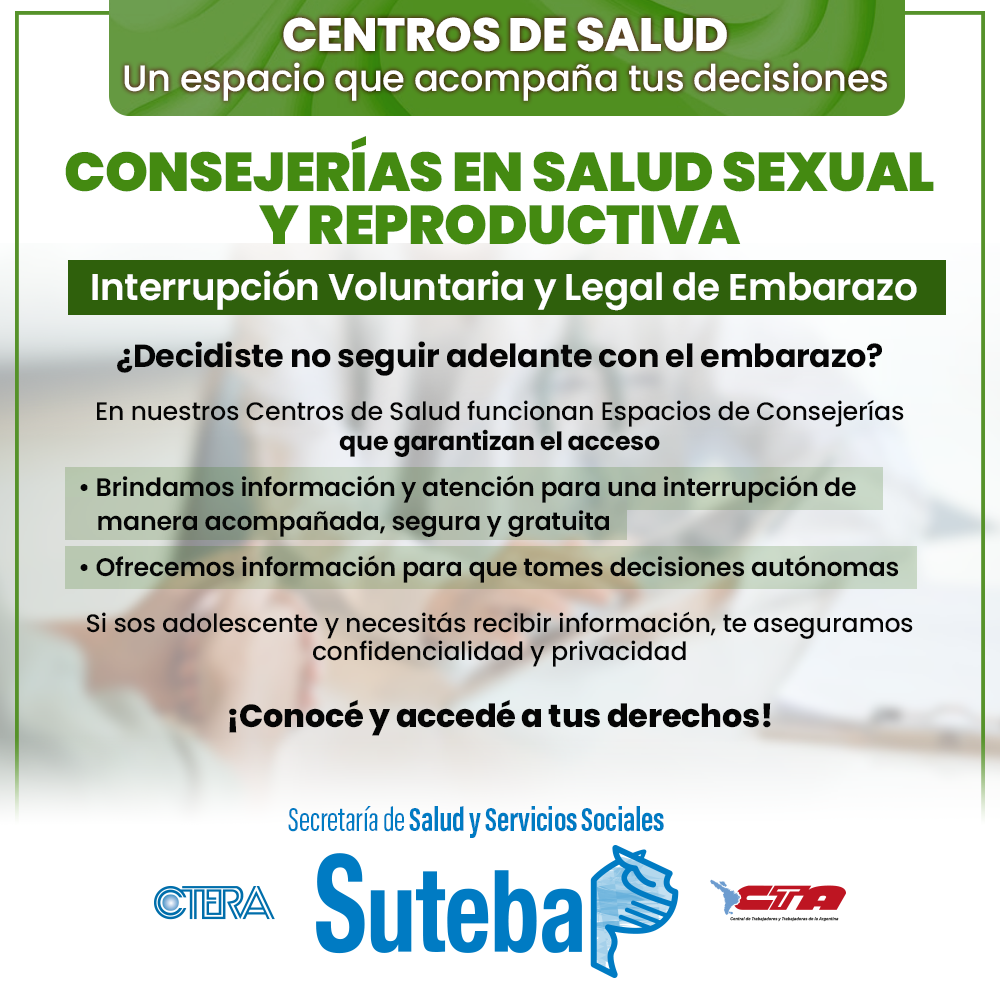 En los Centros de Salud del SUTEBA se encuentran funcionando espacios de Consejerías en donde el Equipo de Salud brinda información y el tratamiento necesario para que puedas acceder a una interrupción de manera segura y gratuita cuando esa sea tu decisión.