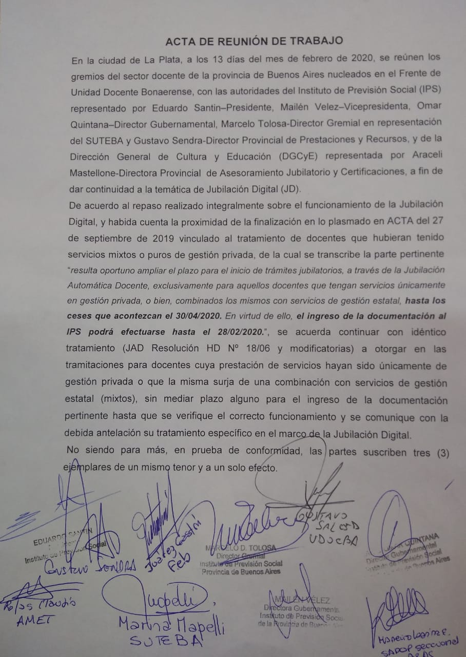 A mediados del mes de febrero de 2020, en continuidad con las reuniones que se vienen manteniendo periódicamente a pedido del Frente de Unidad Docente Bonaerense (FUDB), nos reunimos con las autoridades del Instituto de Previsión Social (IPS) y de la Dirección General de Cultura y Educación (DGCyE), a fin de abordar las problemáticas de la Jubilación Digital y de resolver la continuidad a las Jubilaciones que hubieran tenido servicios mixtos o puros de gestión privada (DIEGEP), por el mecanismo de la Automática.