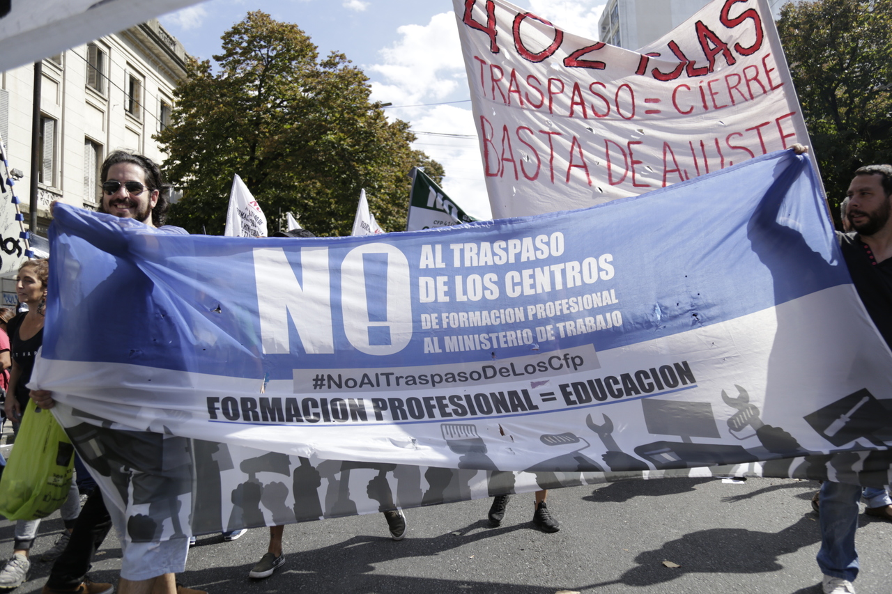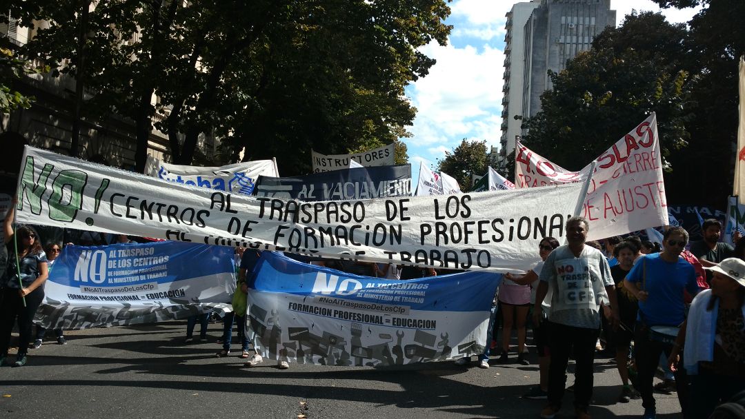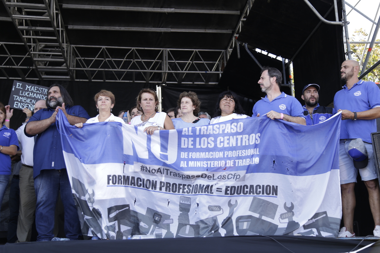Además de las problemáticas particulares de cada sector, en el escenario se hizo especial hincapié en el conflicto de los Centros de Formación Profesional: ¡no vamos a aceptar el traslado al Ministerio de Trabajo!
