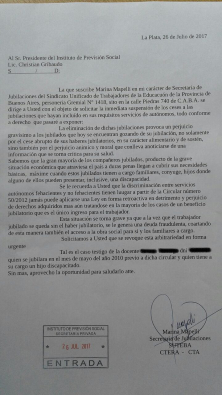 El cese abrupto de estas jubilaciones constituye un perjuicio gravísimo a los jubiladxs porque ya se encuentran gozando de su jubilación, además de verse afectada su salud porque esta situación los compromete en su carácter alimentario y anímico. Este panorama es gravísimo en la dura situación económica que atraviesa el país, ya que los jubiladxs apenas pueden cubrir sus necesidades básicas y hasta tienen familiares a cargo que pueden presentar una discapacidad, como es el caso testigo de una docente que se jubiló en mayo de 2010 y quien tiene un hijo discapacitado a su cargo.