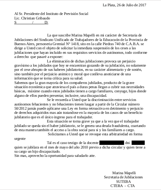 El miércoles 26, desde la Secretaría de Jubilaciones del SUTEBA denunciamos la quita de haberes jubilatorios a docentes que está llevando adelante el IPS. Este accionar es el mismo que ejecutaron el año pasado, también durante el receso invernal, para intentar impedir el acceso a la Jubilación Automática Docente y que pudimos frenar con nuestros reclamos defendiendo nuestros derechos.