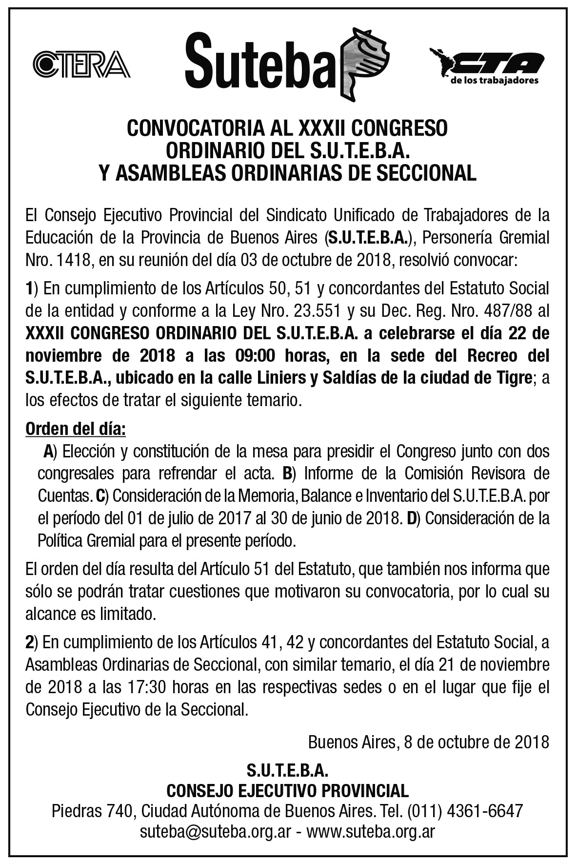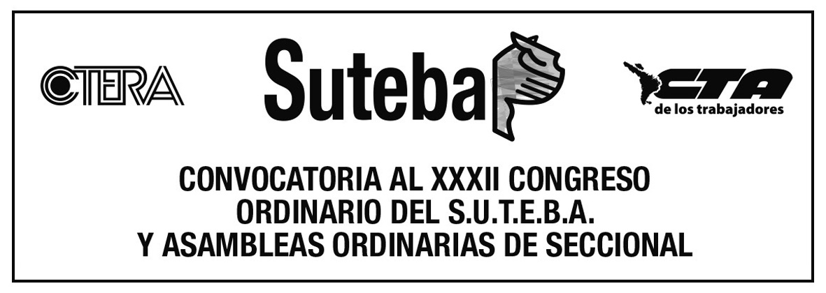 1) En cumplimiento de los Artículos 50, 51 y concordantes del Estatuto Social de la entidad y conforme a la Ley Nro. 23.551 y su Dec. Reg. Nro. 487/88 al XXXII CONGRESO ORDINARIO DEL S.U.T.E.B.A. a celebrarse el día 22 de noviembre de 2018 a las 09:00 horas, en la sede del Recreo del S.U.T.E.B.A., ubicado en la calle Liniers y Saldías de la ciudad de Tigre; a los efectos de tratar el siguiente temario.