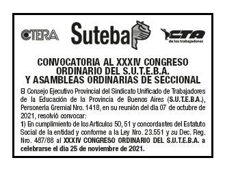El Consejo Ejecutivo Provincial del Sindicato Unificado de Trabajadores de la Educación de la Provincia de Buenos Aires (S.U.T.E.B.A.), Personería Gremial Nro. 1418, en su reunión del día 07 de octubre de 2021, resolvió convocar: