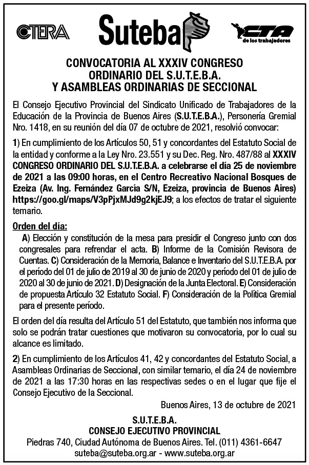 XXXIV CONGRESO ORDINARIO DEL S.U.T.E.B.A. a celebrarse el día 25 de noviembre de 2021 a las 09:00 horas, en el Centro Recreativo Nacional Bosques de Ezeiza (Av. Ing. Fernández García S/N, Ezeiza, provincia de Buenos Aires) https://goo.gl/maps/V3pPjxMJd9g2kjEJ9; a los efectos de tratar el siguiente temario.