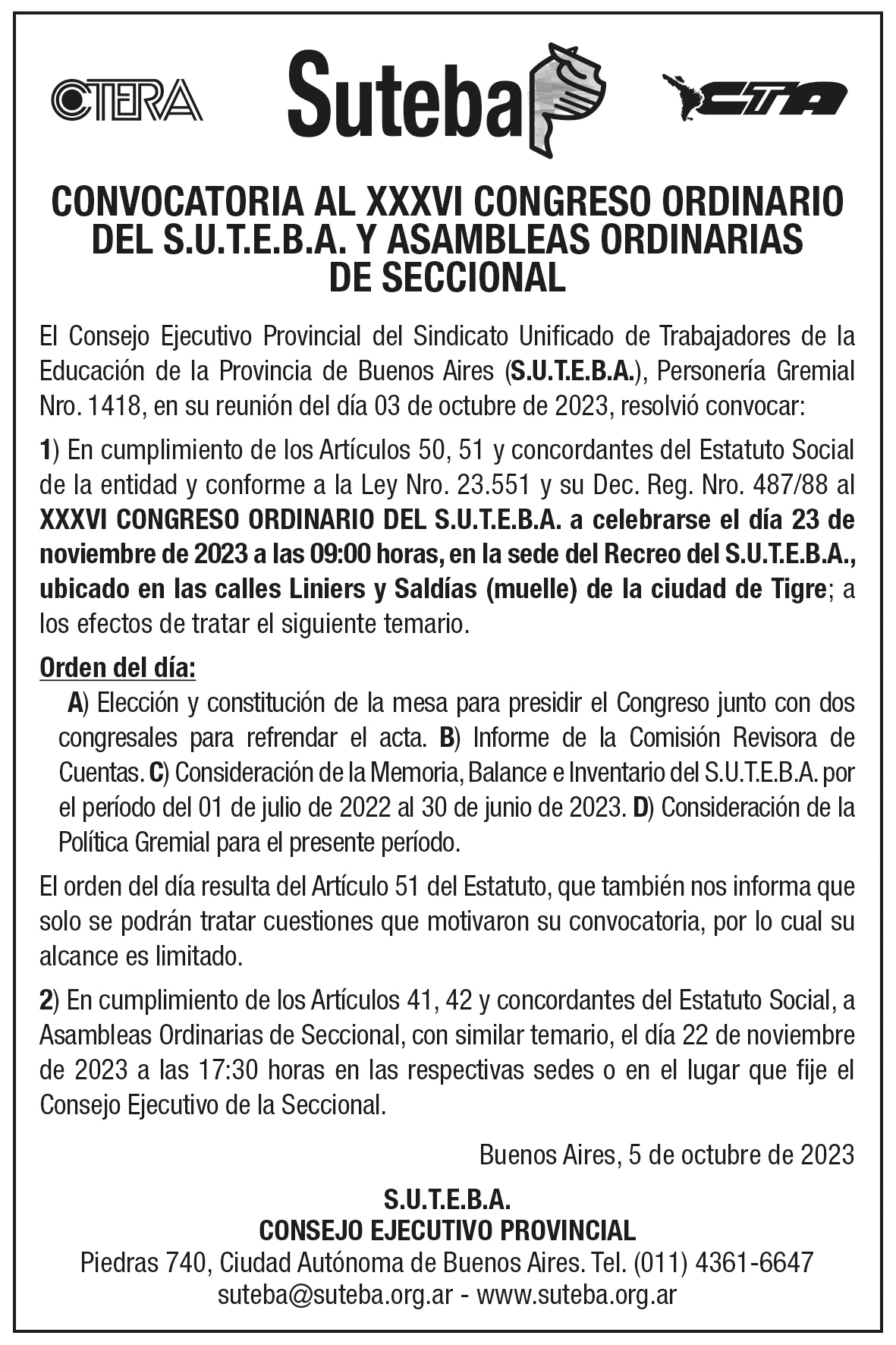 1) En cumplimiento de los Artículos 50, 51 y concordantes del Estatuto Social de la entidad y conforme a la Ley Nro. 23.551 y su Dec. Reg. Nro. 487/88 al XXXVI CONGRESO ORDINARIO DEL S.U.T.E.B.A. a celebrarse el día 23 de noviembre de 2023 a las 09:00 horas, en la sede del Recreo del S.U.T.E.B.A., ubicado en las calles Liniers y Saldías (muelle) de la ciudad de Tigre; a los efectos de tratar el siguiente temario.