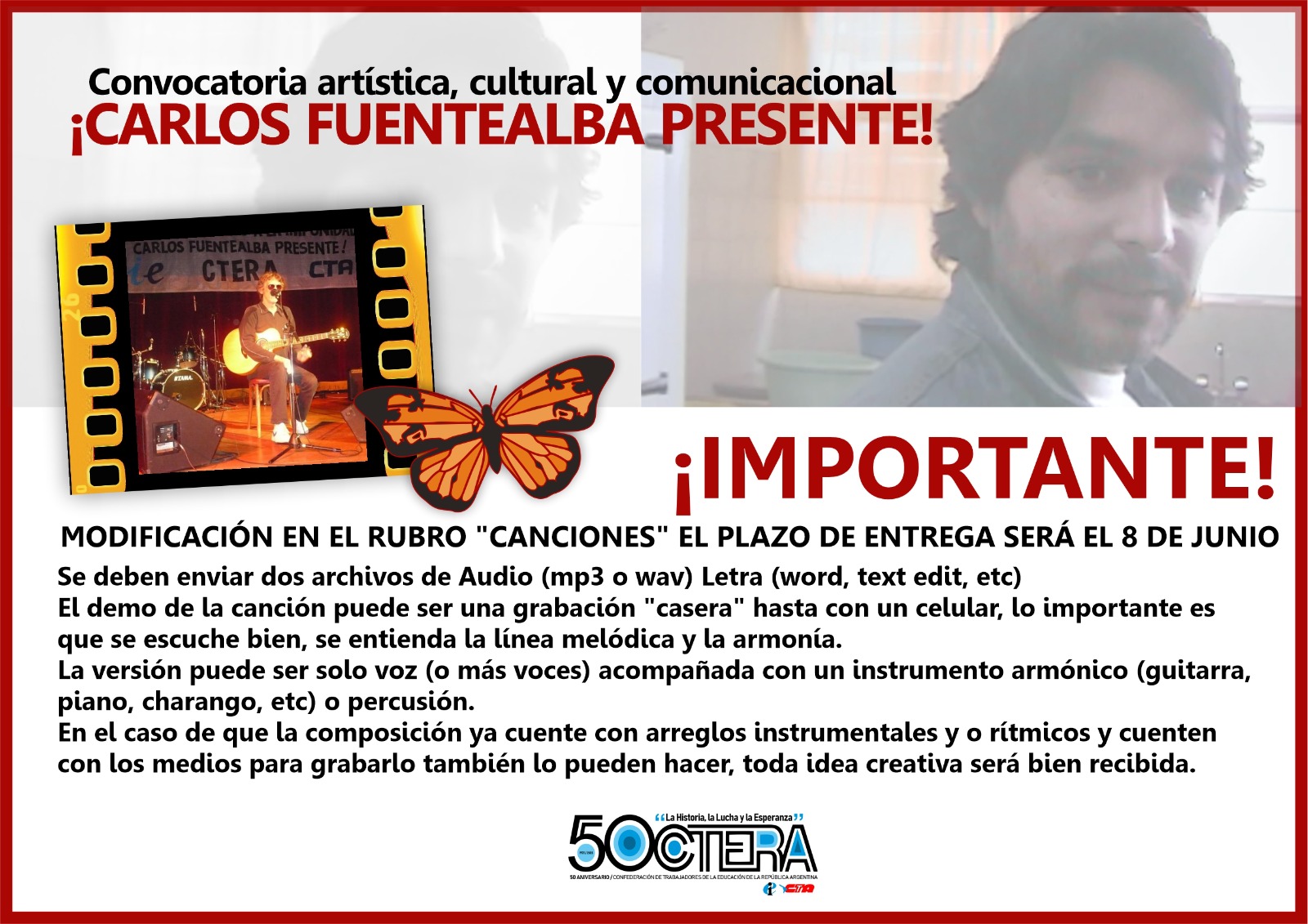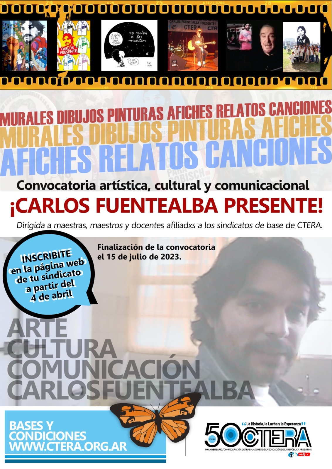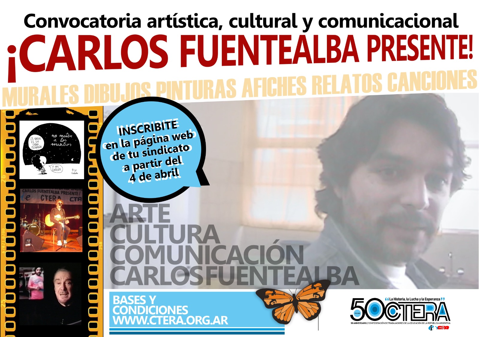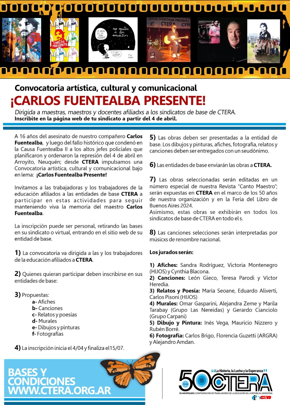A 16 años del asesinato de nuestro compañero Carlos Fuentealba, y luego del fallo histórico que condenó en la Causa Fuentealba II a los altos jefes policiales que planificaron y ordenaron la represión del 4 de abril en Arroyito, Neuquén; desde la CTERA impulsamos una Convocatoria artística, cultural y comunicacional bajo el lema: ¡Carlos Fuentealba, presente!