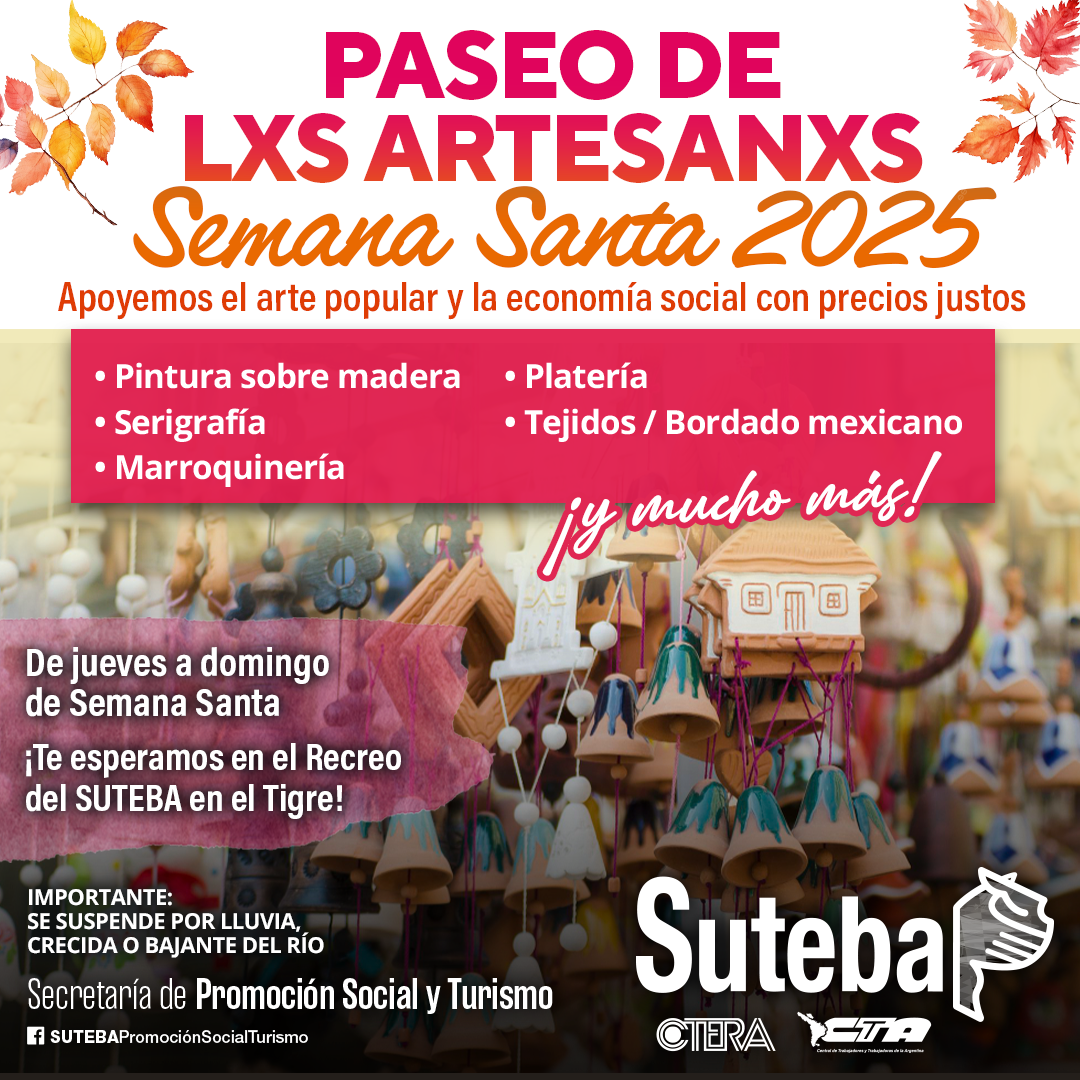 Vuelve el Paseo de Artesanxs a nuestro Recreo del Tigre, que se realizará los días 17, 18, 19 y 20 de abril, y convocamos a todxs lxs compañerxs artesanxs a llevar sus productos para promoverlos y ofrecerlos durante esta Semana Santa.