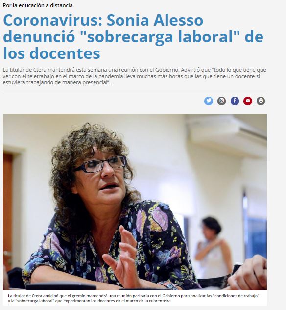 CORONAVIRUS: SONIA ALESSO DENUNCIÓ "SOBRECARGA LABORAL" DE LOS DOCENTES