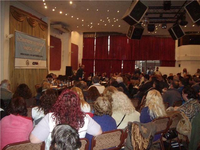 “Cuando se trata de defender nuestros derechos, las organizaciones no son fronteras”.Así lo aseguró María Reigada, Secretaria General de la CTA La Matanza, flanqueada por Carlos Gdansky, Secretario General de la CGT local, en su discurso de bienvenida a los más de 400 compañeros, delegados docentes, metalúrgicos y un amplio abanico de organizaciones sociales que desbordaron las instalaciones del Centro de Industriales Panaderos en San Justo.Posteriormente los panelistas Roberto Baradel, Gonzalo Carbajal, Sergio Fernández Novoa y Néstor Piccone analizaron las implicancias del proyecto de Ley de Servicios Audiovisuales.La jornada había comenzado con un gesto de unidad de los presentes quienes cantaron el Himno Nacional, y culminó de la misma forma cuando ellos se fueron charlando animadamente acerca de lo histórico del encuentro.Todos los presentes coincidieron en la necesidad política de apoyar e impulsar esta ley para profundizar la distribución de la riqueza y de la palabra, y fortalecer la democracia en una sociedad profundamente atravesada por el discurso mediático.