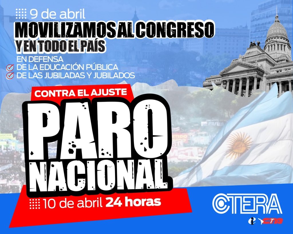 La CTERA convoca a un Paro Nacional Docente el jueves 10 de abril y a una movilización en todo el país el miércoles 9 de abril, en defensa de la educación pública, los derechos de las y los trabajadores de la educación y de nuestros jubilados y jubiladas. Estas medidas son la continuidad del plan de lucha aprobado en el congreso de nuestra entidad en febrero de este año.