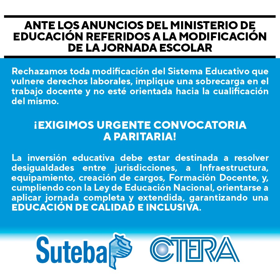 Ante las noticias difundidas por los medios de comunicación sobre la decisión unilateral del Ministerio de Educación Nacional referidas a la modificación de la jornada escolar de la educación primaria, desde CTERA planteamos el rechazo de toda modificación del sistema educativo que vulnere los derechos laborales, implique una sobrecarga en el trabajo docente y no esté orientada hacia la cualificación del sistema educativo.