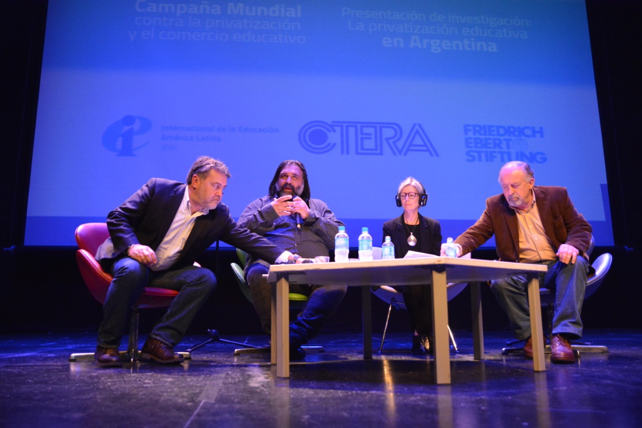 CTERA y la Internacional de la Educación – que representa a 34 millones de docentes de todo el mundo - presentaron la investigación sobre "Tendencias privatizadoras de y en la Educación Argentina." El informe lo brindaron Susan Robertson - Asesora Pedagógica Universidad Cambridge -, Angelo Gavrielatos - Director de la Campaña Mundial de la IE contra la Privatización y Mercantilización de la Educación -, Roberto Leao - Vicepresidente IE - , Combertty Rodríguez - Coordinador Principal de la IEAL - y Adriana Puiggrós - Investigadora -.