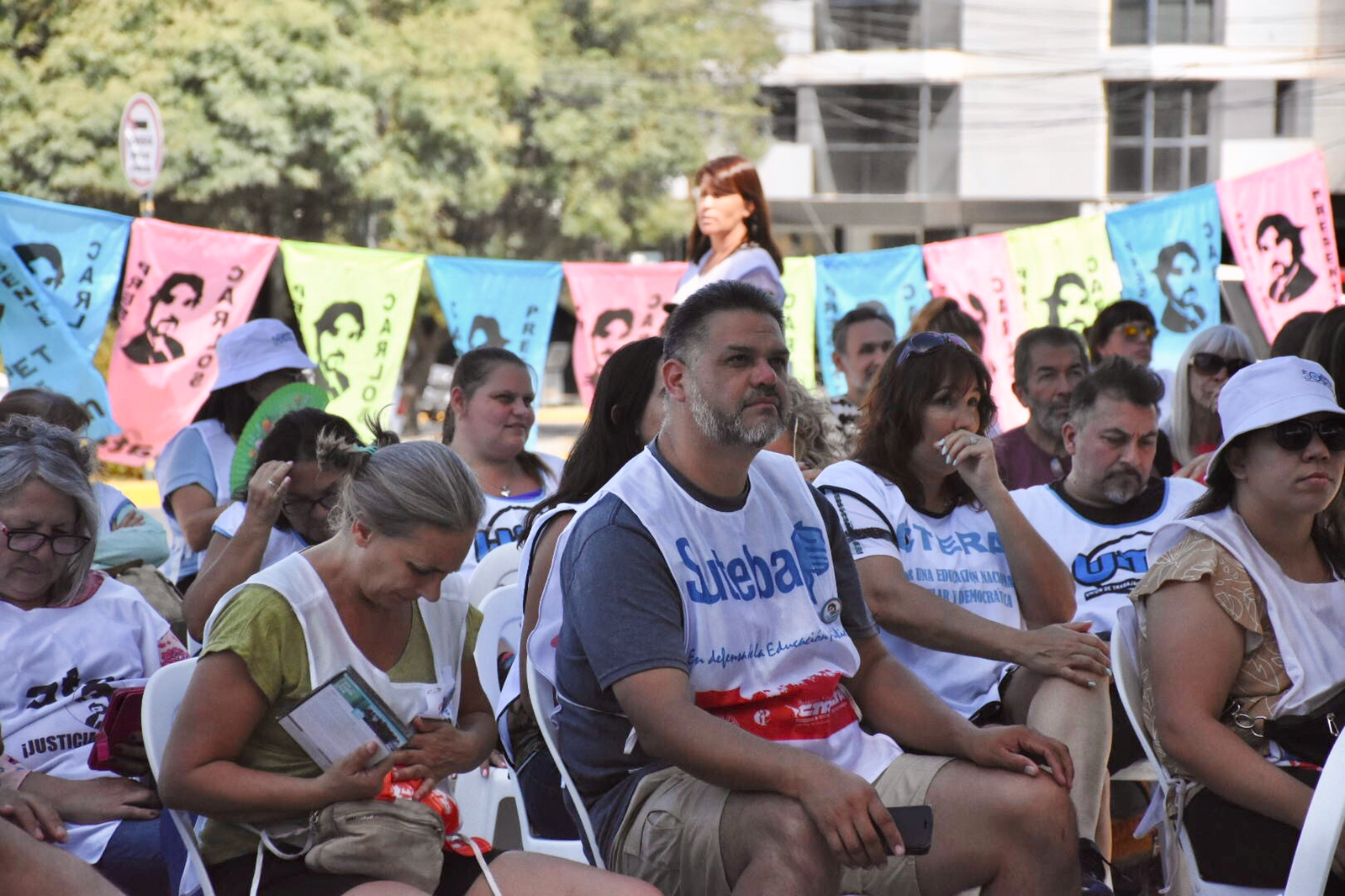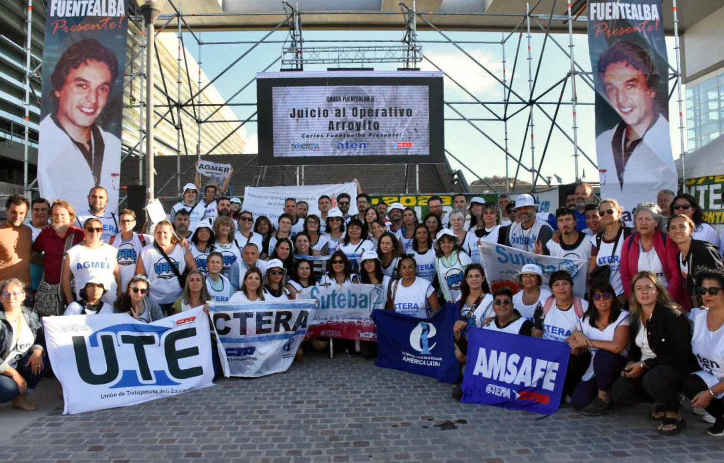 Sonia Alesso, Secretaria General de la CTERA, junto a Juan Monserrat (UEPC Córdoba), María Laura Torre y Silvia Almazán (SUTEBA), Docentes de AMSAFE (Santa Fe), AGMER (Entre Ríos) y UTE (Ciudad de Buenos Aires), y María Reigada, Senadora Provincial de Buenos Aires; están presentes hoy en Neuquén por el juicio de la Causa Fuentealba II.