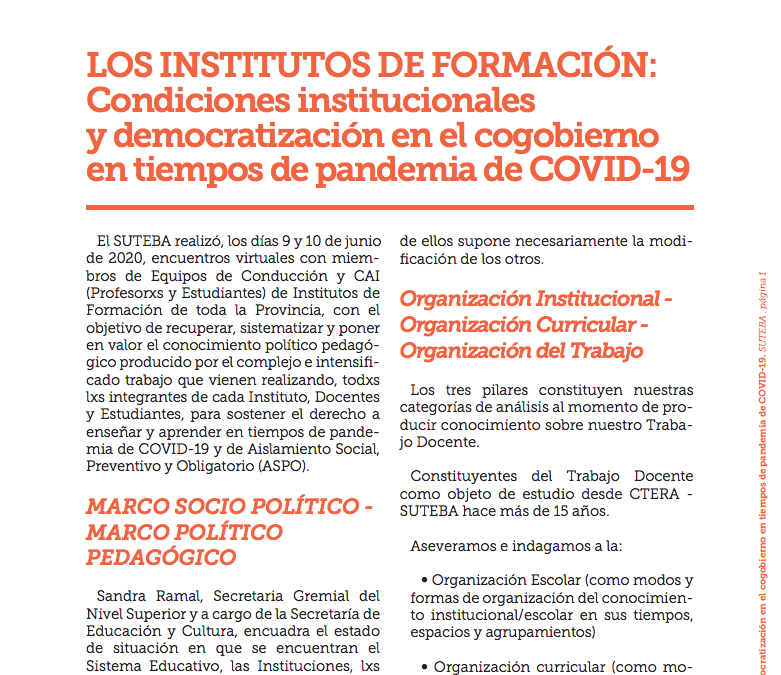 El SUTEBA busca así la recuperación, sistematización y puesta en valor del conocimiento político pedagógico producido por el inmenso trabajo que viene realizándose desde los Institutos para sostener el derecho a enseñar y aprender en tiempos de pandemia por el COVID-19 y de Aislamiento Social, Preventivo y Obligatorio (ASPO).