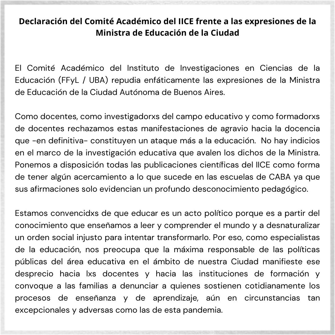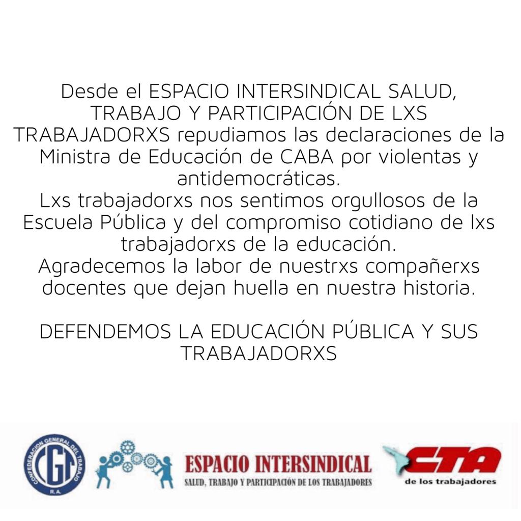 La ministra habla de la importancia de enseñar a pensar, mientras estigmatiza a los docentes que trabajan y luchan por mejorar sus condiciones para formarse como actores partícipes de la educación y no como tecnócratas fuera de su historia. Instala la desconfianza sobre la tarea docente en las familias, como si padres y madres debieran cumplir una tarea de vigilancia sobre quienes han estudiado para enseñar, deslegitimando su labor. Incluso insta a la denuncia como en las peores épocas de nuestra historia. Las palabras de la ministra lastiman a toda la sociedad y merecen más que unas disculpas. Instamos al jefe de Gobierno de la Ciudad Autónoma de Buenos Aires, Horacio Rodríguez Larreta a tomar medidas, porque estas declaraciones no constituyen un hecho aislado: son la ideología con la que se piensan las políticas públicas de educación en la ciudad que más recursos concentra y que menos igualitariamente los distribuye.
