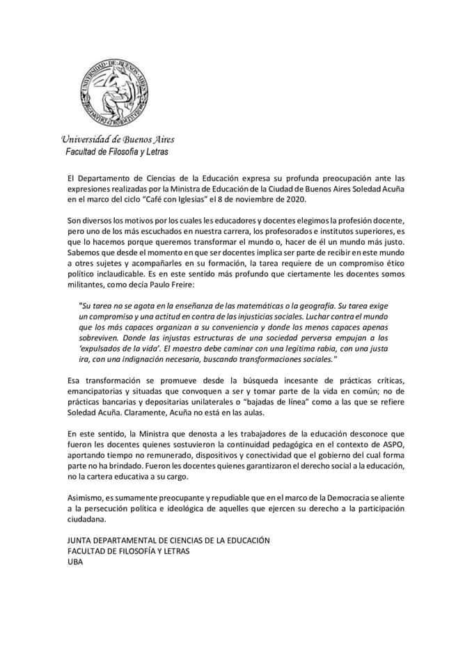 Frente a las estigmatizantes declaraciones emitidas por Soledad Acuña, Ministra de Educación de CABA; diversas Organizaciones y entidades expresaron sus más sentidas muestras de apoyo a la Educación Pública y en absoluto repudio a tales expresiones.