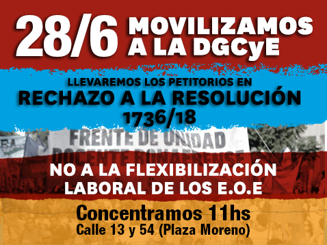 En el día de hoy, el Frente de Unidad Docente Bonaerense, junto a Equipos de Orientación Escolar y delegaciones de toda la Provincia, se movilizará a la Dirección General de Cultura y Educación y llevará los petitorios en RECHAZO A LA RESOLUCIÓN 1736/18 Y A LA FLEXIBILIZACIÓN LABORAL DE LOS EOE.