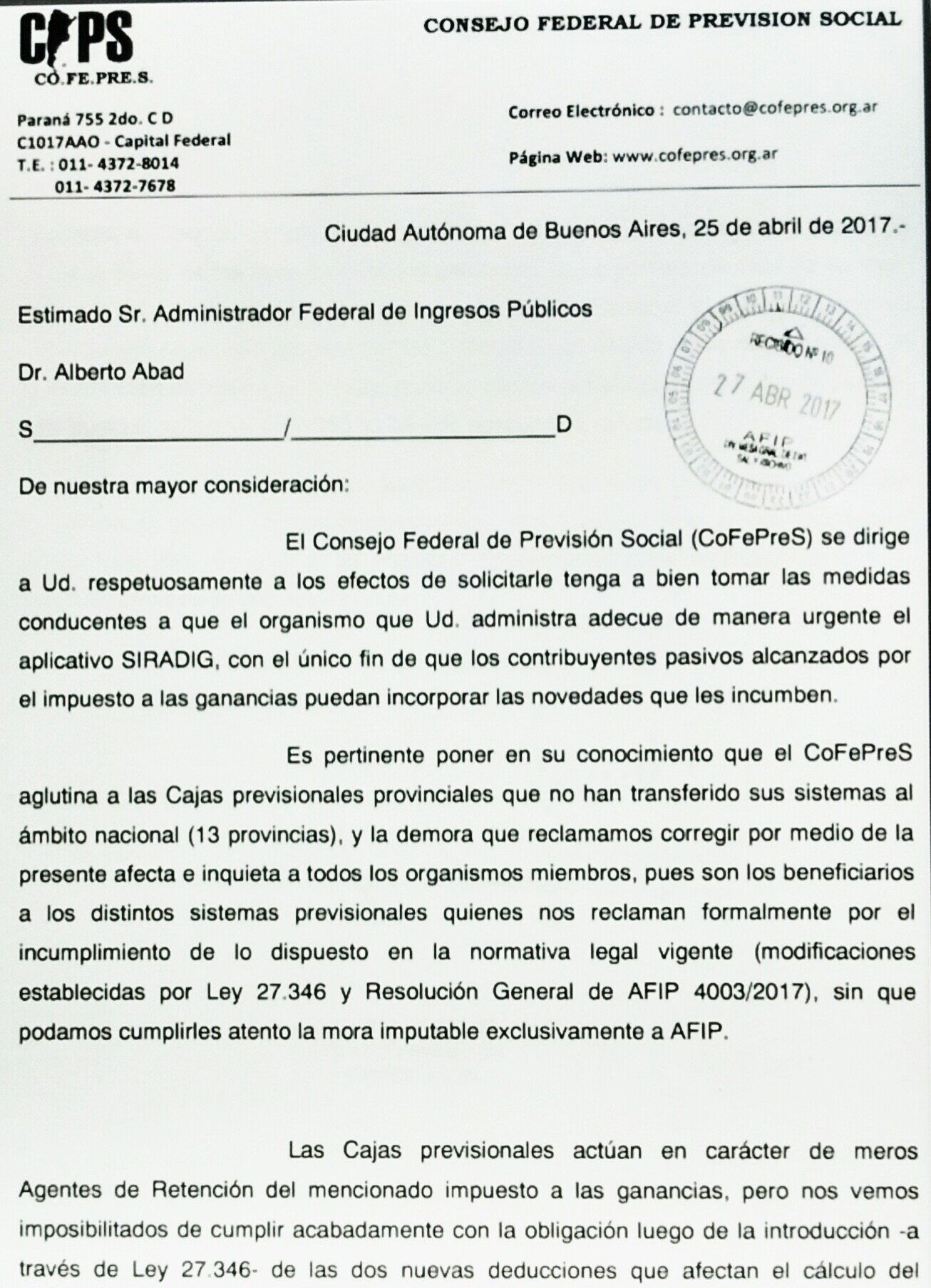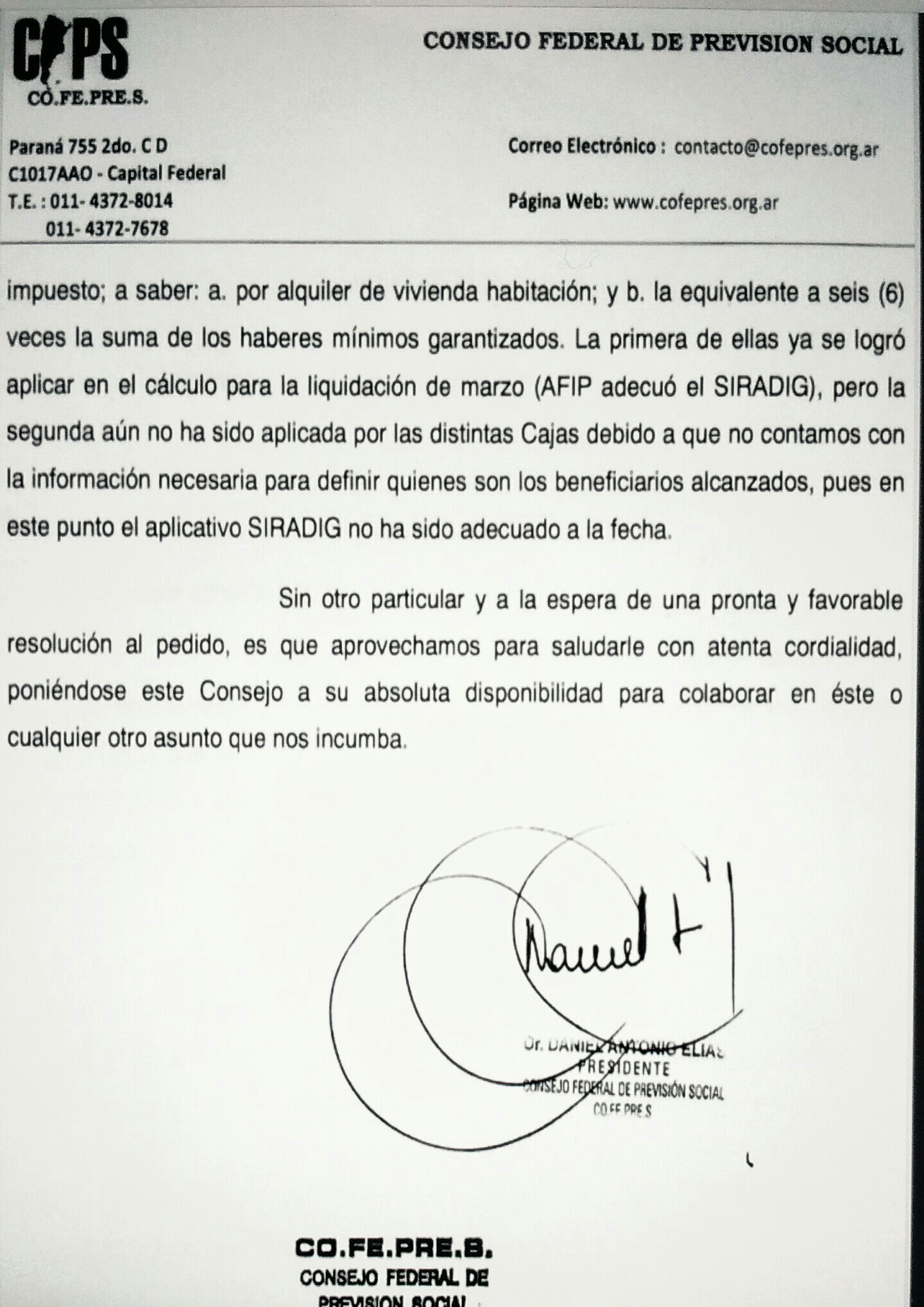 En tal sentido desde la Dirección como representación Gremial se han recepcionado consultas al respecto y planteado con preocupación el tema ante el Directorio del IPS dado su carácter de Agente de Retención del impuesto. Desde el COFEPRES (Consejo Federal de Previsión Social) conformado por cajas previsionales no integrantes del ANSES, del cual forma parte el IPS, se hizo la presentación de un reclamo dirigido a la AFIP.