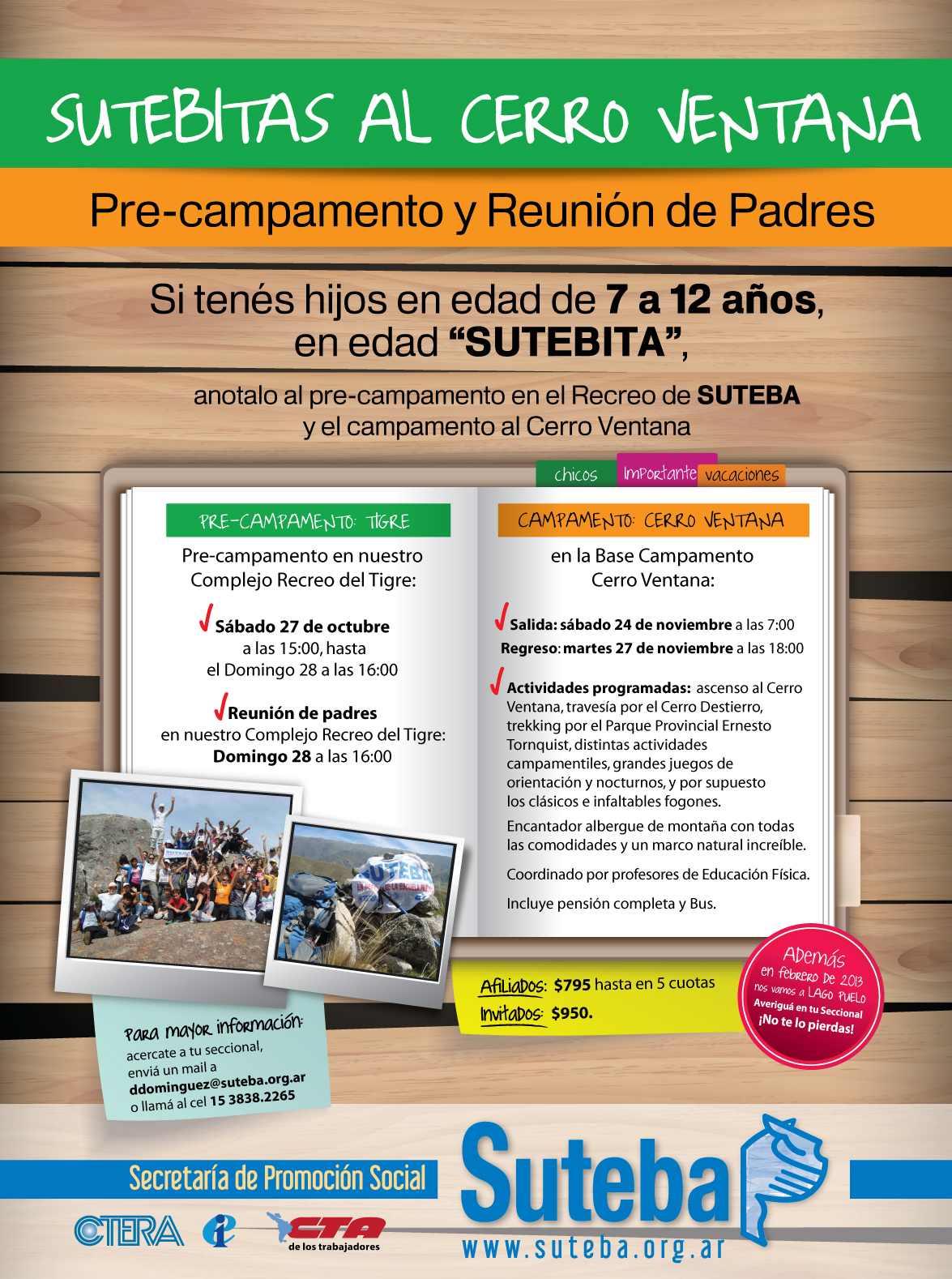 Este año los SUTEBITAS vuelven al Cerro Ventana y, como siempre, a fin de garantizar una perfecta organización y pasarla bien, nos juntamos con un pre-campamento en nuestro Complejo Recreo del Tigre y terminamos con una reunión de padres.