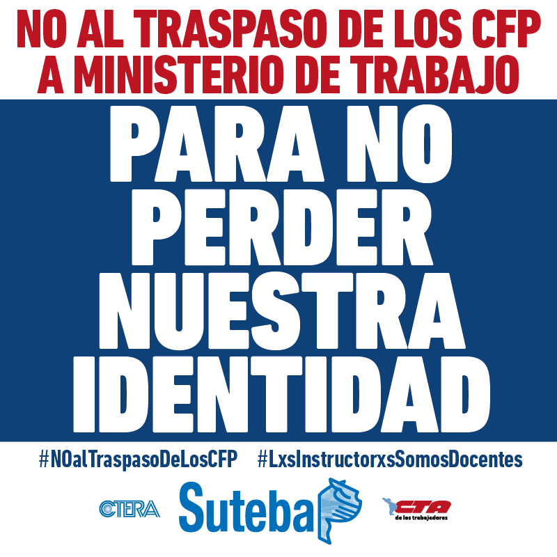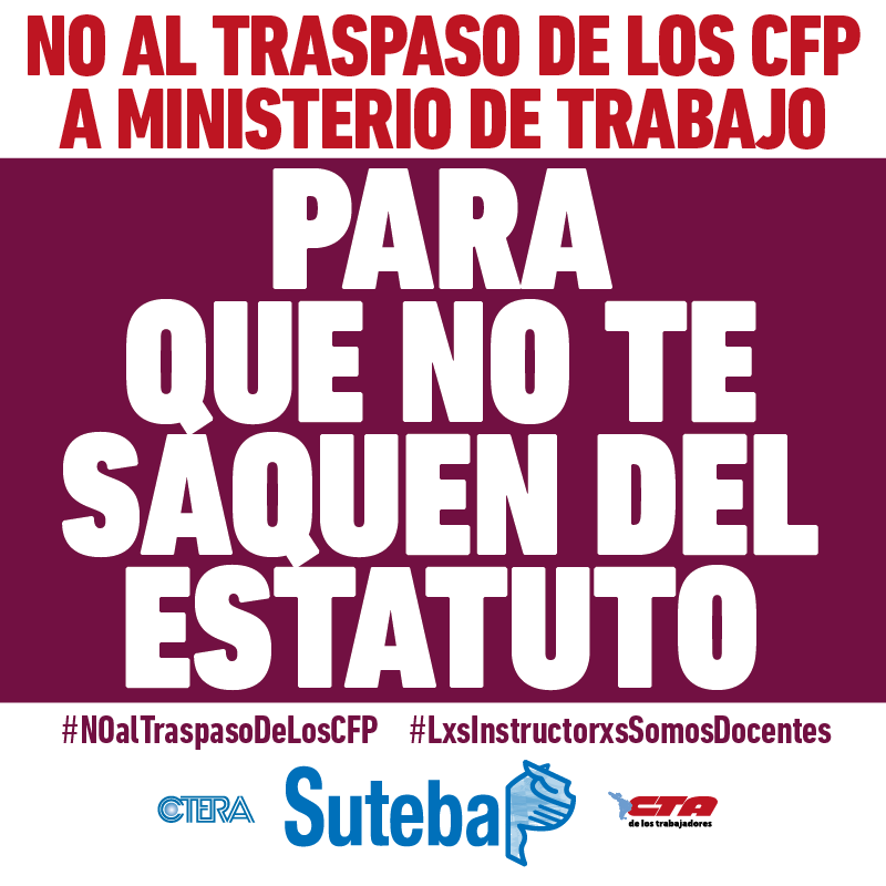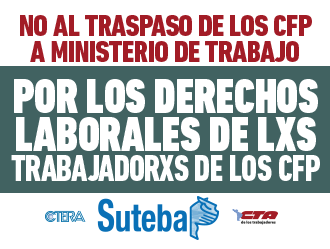 Desde el SUTEBA nos preocupa profundamente la situación de lxs Docentes que se desempeñan en los CFP, que están luchando desde la vuelta a la democracia por su estabilidad e inclusión plena en el estatuto del Docente y Acuerdos Paritarios y quienes están a punto de lograr el máximo derecho de todo trabajador, que es la estabilidad, ya que en estos momentos están por salir las primeras titularizaciones masivas en el marco de un Acuerdo Paritario. Es justamente ahora donde debemos redoblar los esfuerzos en pos de la defensa de sus derechos laborales y por eso decimos con vehemencia: ¡No al traspaso de los CFP conveniados al Ministerio de Trabajo!