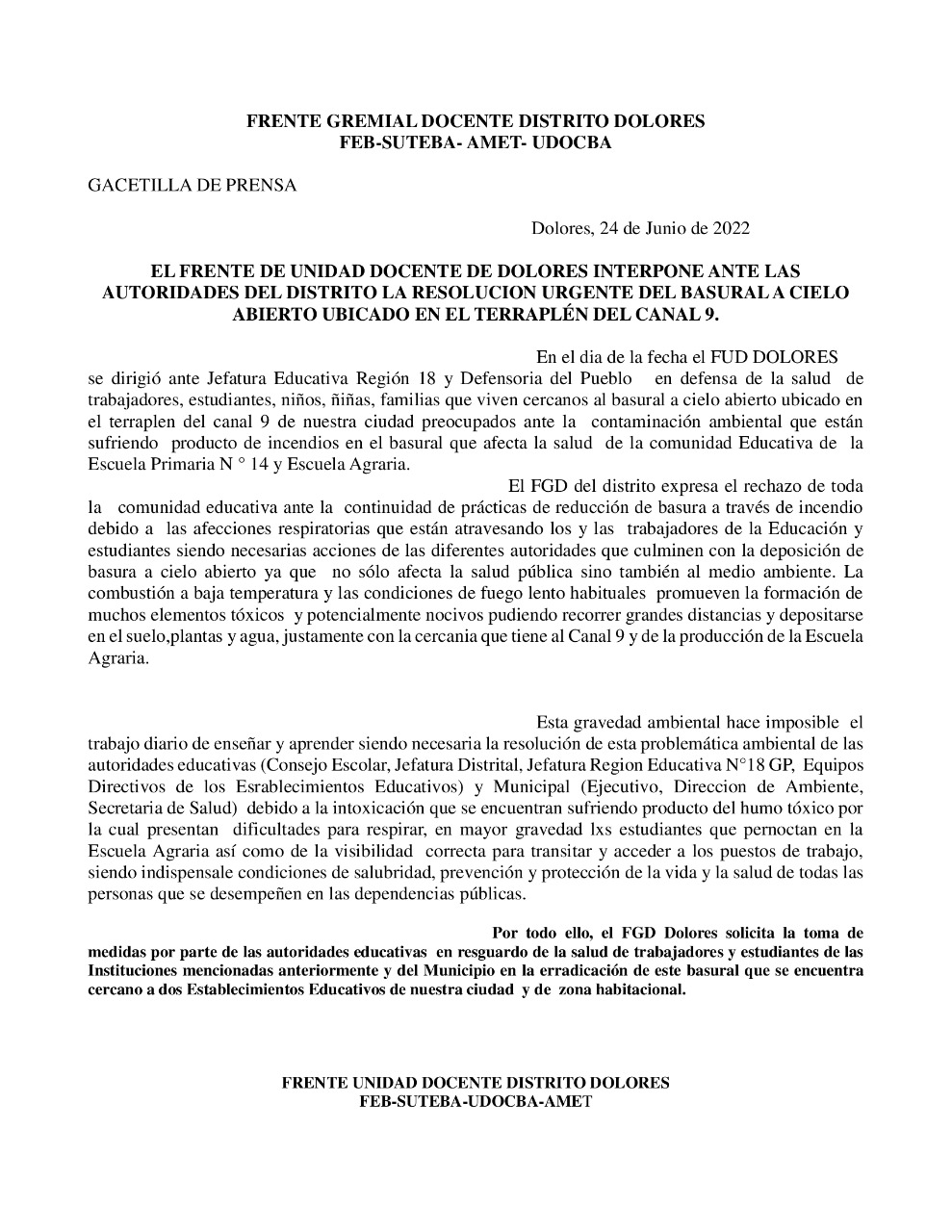 Luego, el SUTEBA se hizo presente en la Escuela Primaria Nº 14 "Dr. Victoriano E. Montes". La conducción del SUTEBA de Dolores entregó un petitorio para que firme la Comunidad de las Escuelas, solicitándole al Ejecutivo Municipal la erradicación del basural a cielo abierto en el marco de la normativa vigente.