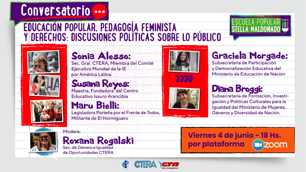 El viernes 4 de junio se llevó adelante el segundo encuentro de la Escuela Popular de Género Stella Maldonado. Participaron como expositoras Diana Broggi, Subsecretaria de Formación, Investigación y Políticas Culturales para la Igualdad del Ministerio de Mujeres, Géneros y Diversidad de la Nación; Maru Bielli, legisladora porteña por el Frente de Todos, Docente y militante de El Hormiguero; Susana Reyes, Maestra, fundadora del Centro Educativo Isauro Arancibia; y Graciela Morgade, Subsecretaria de Participación y Democratización Educativa del Ministerio de Educación de la Nación; actuando como moderadora Roxana Rogalski, Secretaria de Género e Igualdad de Oportunidades de CTERA.
