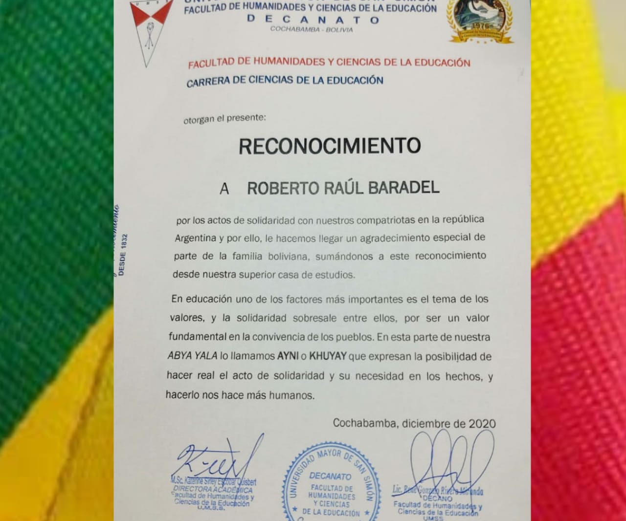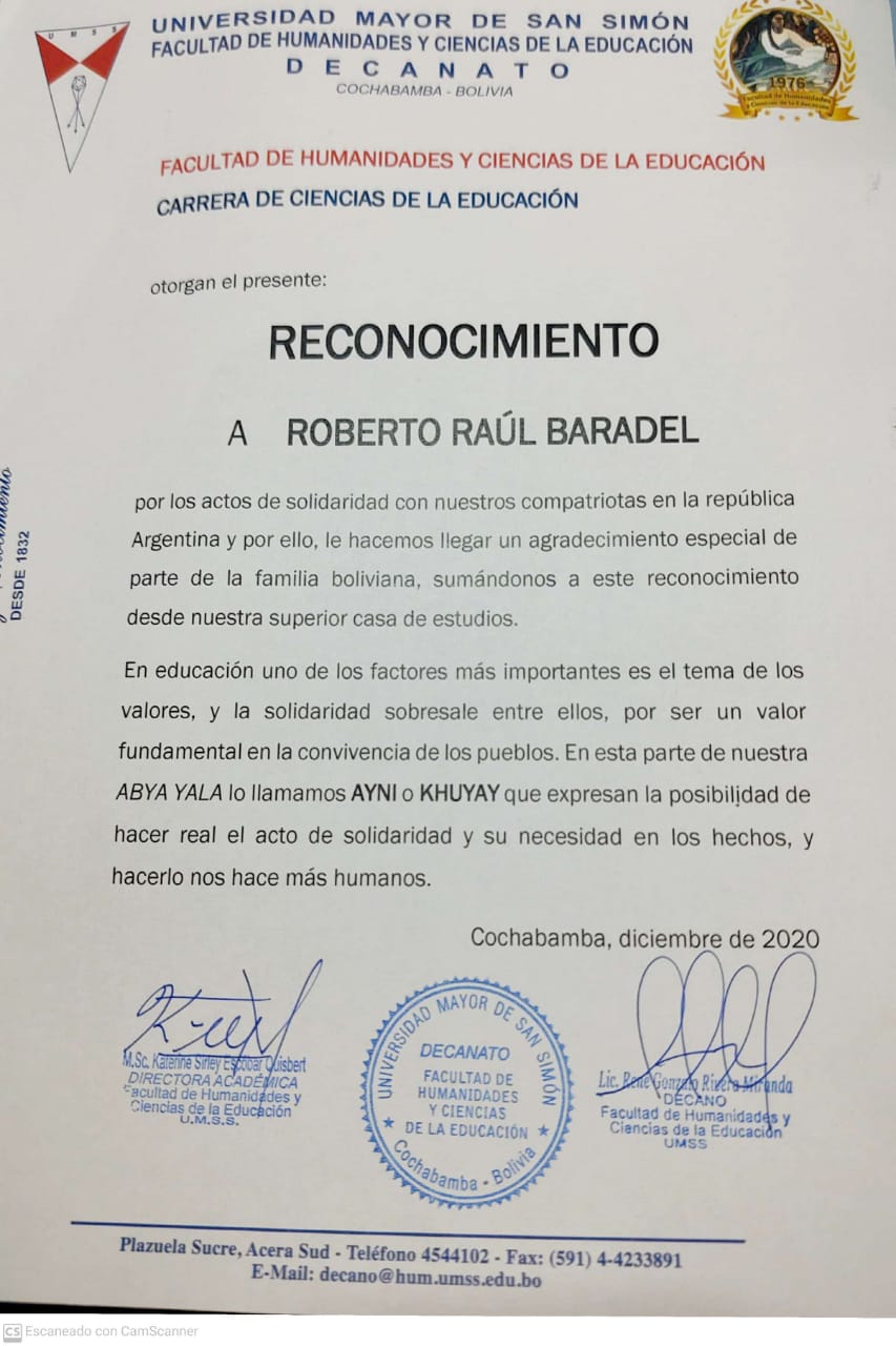 EL COMPAÑERO ROBERTO BARADEL RECONOCIDO POR EL GOBIERNO DE BOLIVIA Y LA UNIVERSIDAD MAYOR DE SAN SIMÓN