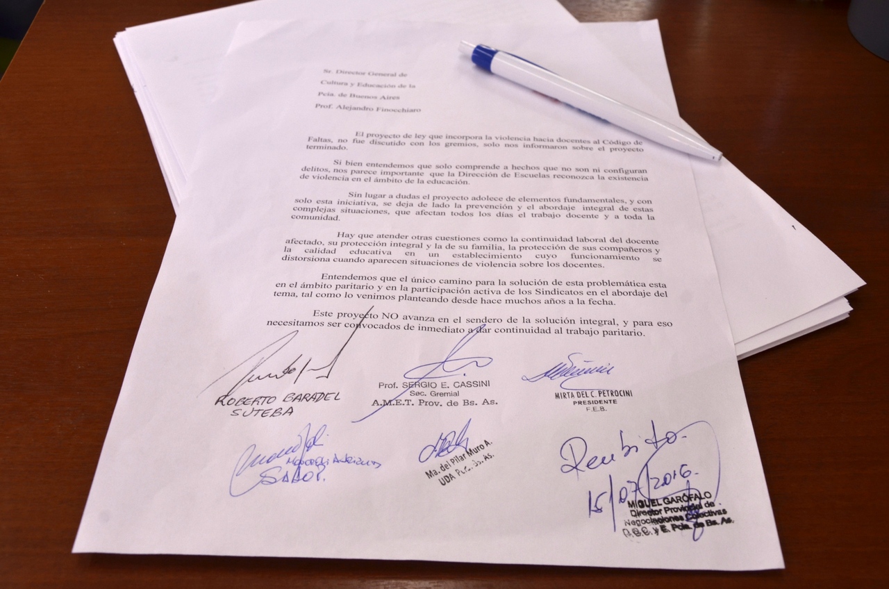 En el marco de la Comisión Técnica de las Condiciones de Trabajo, ante las declaraciones emitidas el jueves 14 por el Director General de Escuelas anunciando la presentación de un Proyecto de Ley del Gobierno Provincial ante la Legislatura bonaerense, en relación a violencia hacia los docentes en el ámbito escolar; el FGDB presentó un comunicado sentando posición ante dicho proyecto y exigiendo participación REAL en las definiciones de medidas y acciones relacionadas a situaciones de violencia hacia los Trabajadores de la Educación en el ámbito escolar. Es decir, abordar esta compleja temática en los ámbitos paritarios correspondientes.