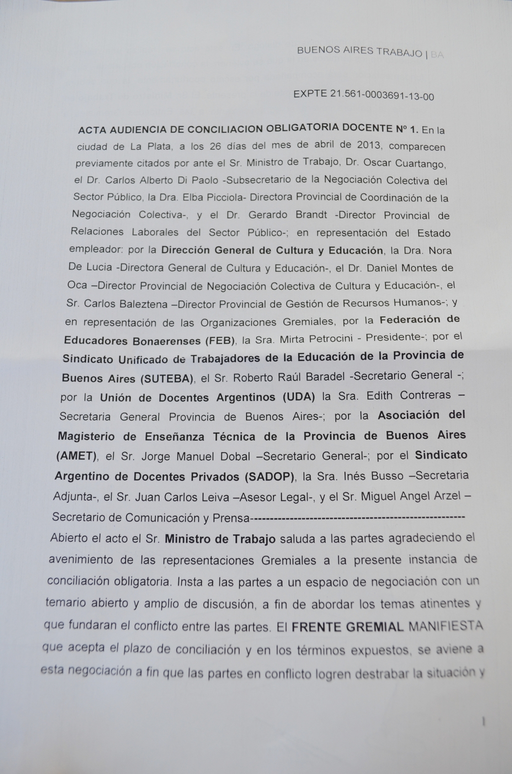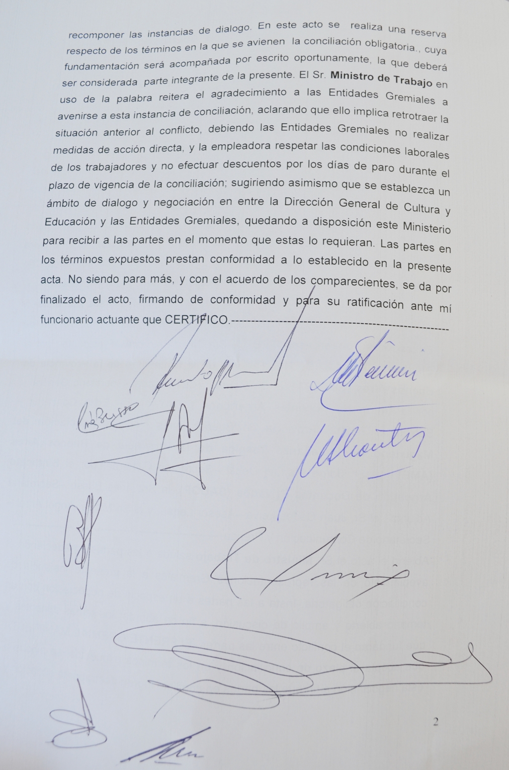 Además Baradel comentó que durante la reunión, los gremios y el Gobierno provincial firmaron el Acta Audiencia de Conciliación Obligatoria Docente en donde, según declaró Baradel “está escrito que el Gobierno se compromete a no aplicar ningún tipo de descuento por los días de paro a todos los trabajadores de la educación y los gremios se abstienen de realizar medidas de fuerza mientras que dure la negociación”.