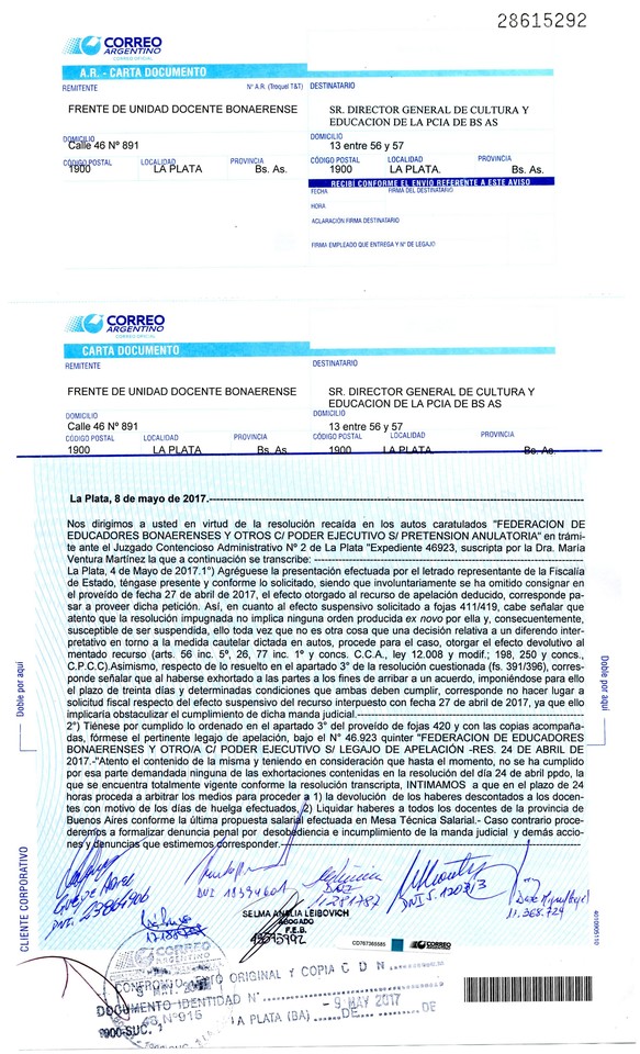 Los integrantes del Frente de Unidad Docente (FUD), exigimos mediante carta documento a la Dirección General de Cultura y Educación (DGCyE) que cumpla con el fallo judicial que indica que: