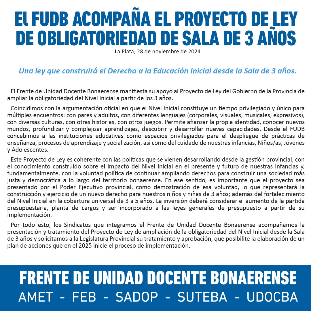 Por todo esto, los Sindicatos que integramos el Frente de Unidad Docente Bonaerense acompañamos la presentación y tratamiento del Proyecto de Ley de ampliación de la obligatoriedad del Nivel Inicial desde la Sala de 3 años y solicitamos a la Legislatura Provincial su tratamiento y aprobación, que posibilite la elaboración de un plan de acciones que en el 2025 inicie el proceso de implementación.