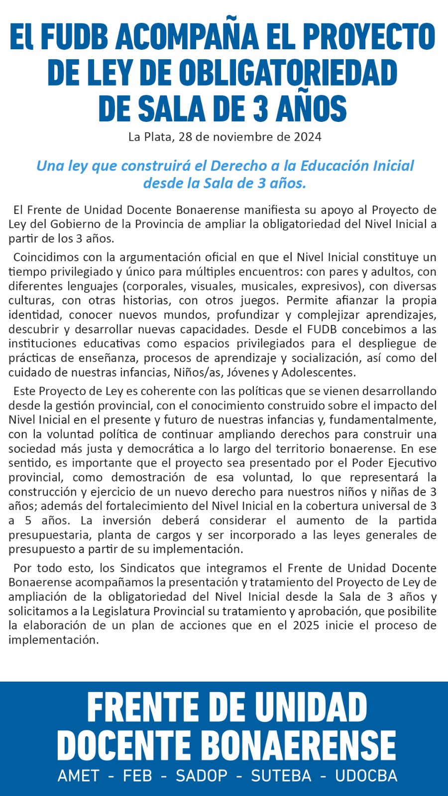 Por todo esto, los Sindicatos que integramos el Frente de Unidad Docente Bonaerense acompañamos la presentación y tratamiento del Proyecto de Ley de ampliación de la obligatoriedad del Nivel Inicial desde la Sala de 3 años y solicitamos a la Legislatura Provincial su tratamiento y aprobación, que posibilite la elaboración de un plan de acciones que en el 2025 inicie el proceso de implementación.