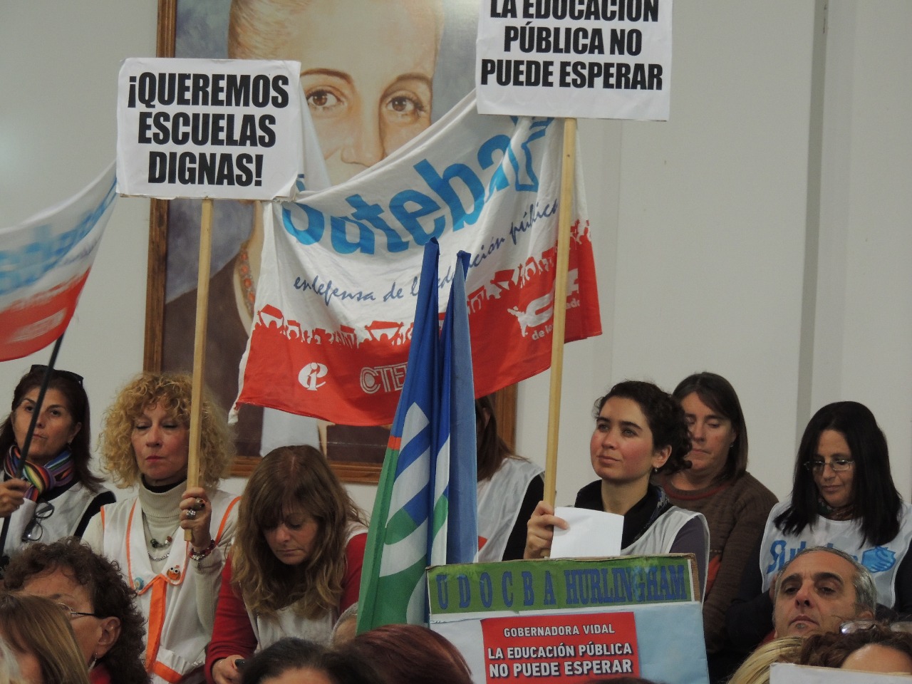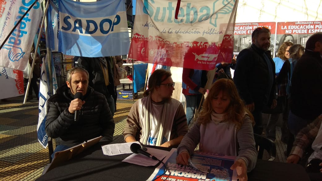 El Secretario General del SUTEBA, Roberto Baradel, expresó: "El CARPETAZO que hicimos ayer refleja claramente lo que pasa en las Escuelas bonaerenses: lo que sufren lxs chicxs y lxs Docentes. Lo que intenta hacer el Gobierno es lo que hacían en los 90 con las empresas del Estado: dejarlas caer para que se puedan privatizar".