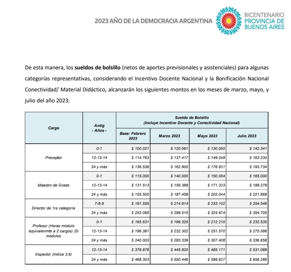 En ese marco, la gestión provincial planteó una Paritaria corta, que contempla la recomposición salarial de las y los Trabajadores de la Educación para el primer semestre 2023. Por lo tanto, la propuesta salarial que hace el Estado provincial toma como base de cálculo el mes de febrero, elevando en un 43.5% el salario del Maestro de Grado Inicial en tres tramos: marzo, mayo y julio -con impacto en el básico, por lo que las y los Docentes Jubilados percibirán el aumento.