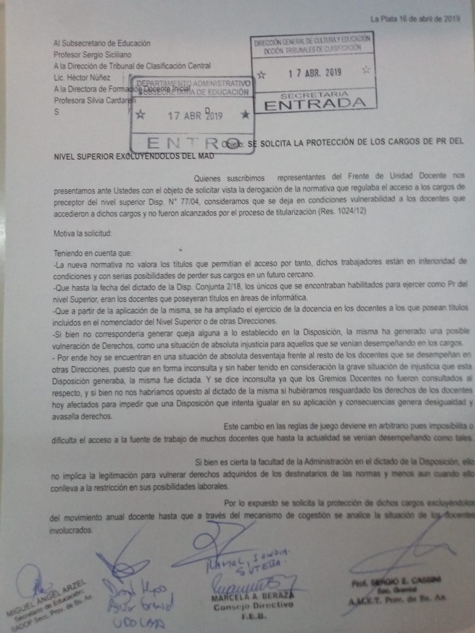 En el marco del Frente de Unidad Docente Bonaerense, hoy se presentó el pedido de protección de los cargos de Preceptor/a de Educación Superior ante la Subsecretaría de Educación y la Dirección de Tribunales de Clasificación.