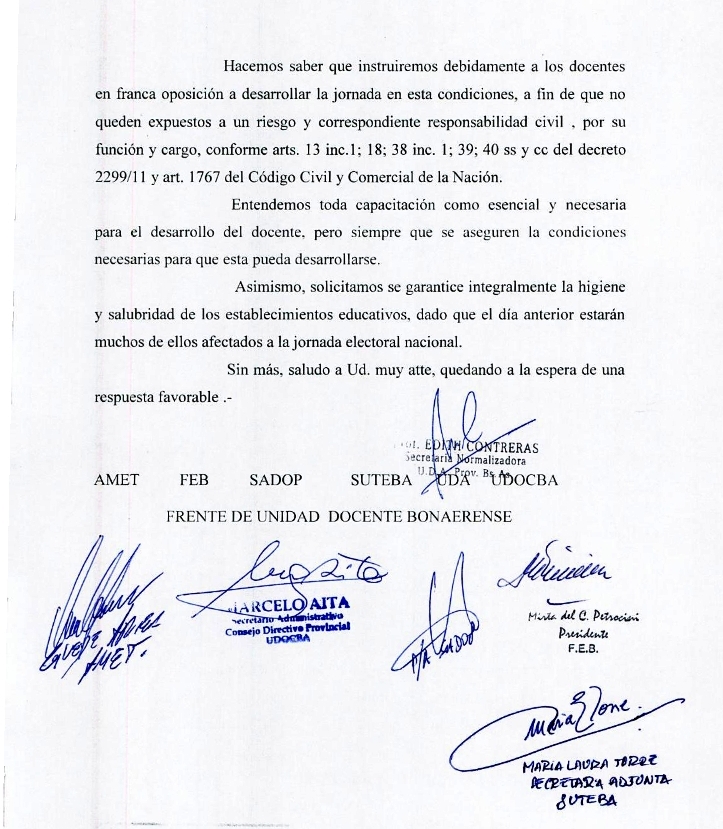 "Hacemos saber que instruiremos debidamente a lxs Docentes en franca oposición a desarrollar la jornada en esta condiciones, a fin de que no queden expuestos a un riesgo ni lxs Trabajadorxs de la Educación ni lxs alumnxs", se enfatizó en la presentación.