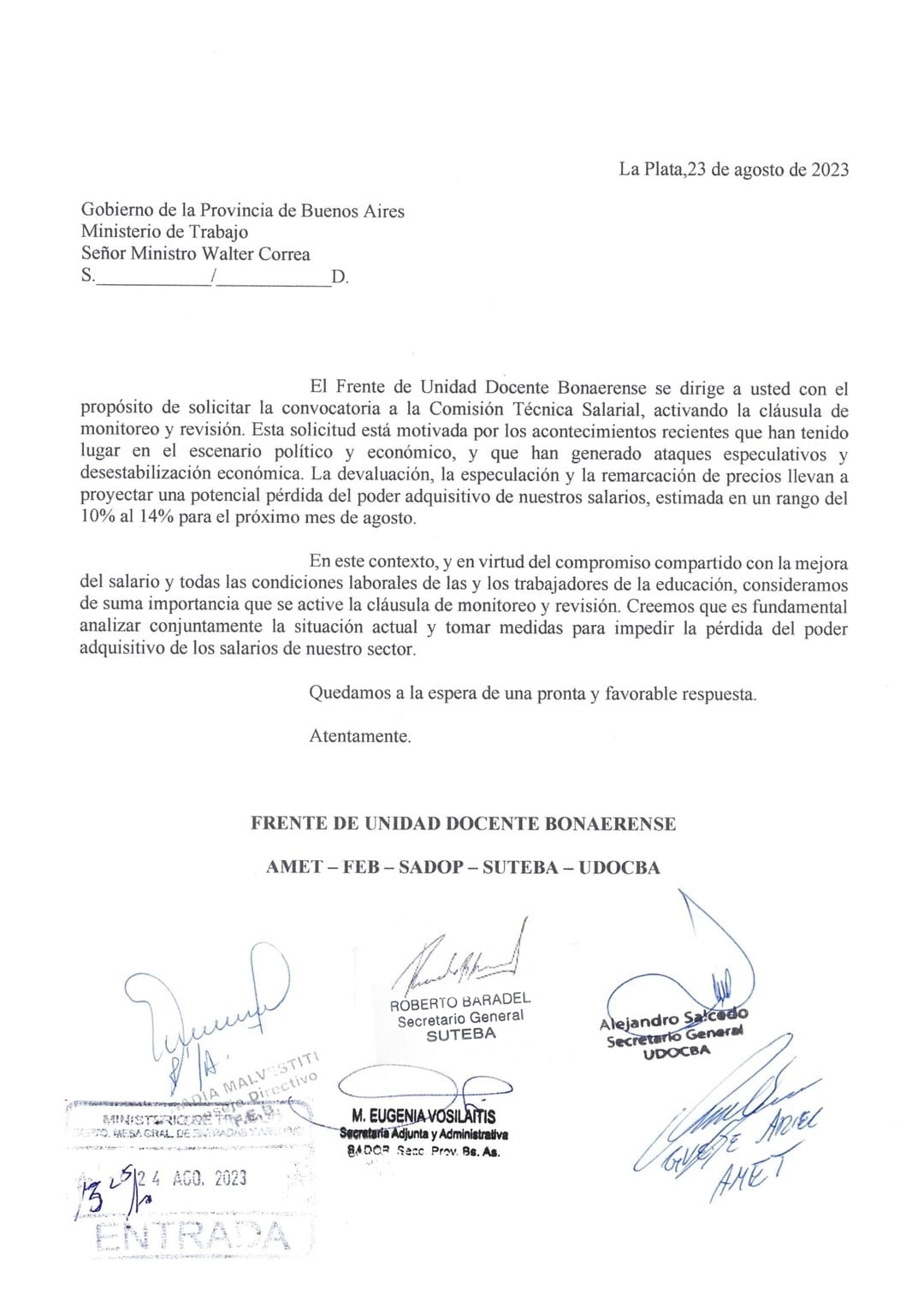 El Frente de Unidad Docente Bonaerense solicitó al Gobierno de la provincia de Buenos Aires la convocatoria a la Comisión Técnica Salarial, activando la cláusula de monitoreo y revisión vigente en la paritaria.