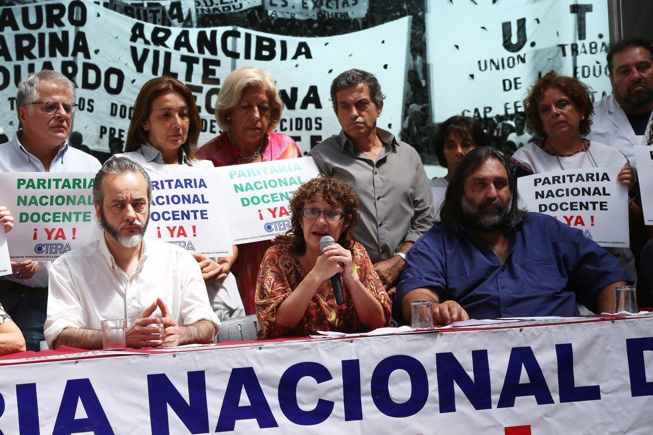 Queremos señalar que es inédita la presión del Gobierno Nacional sobre los gobiernos provinciales, desde plantear que si no cumplen con ese techo del 15 % no va haber fondos para las provincias, hasta plantear aislar a la CTERA en la discusión. Esto es grave en la democracia, nosotros representamos a cientos de miles de docentes en todo el país, hemos sido electos democráticamente, participamos del ámbito de las paritarias provinciales y también hay una Ley del Congreso de la Nación, votada por amplísima mayoría, que está siendo incumplida.
