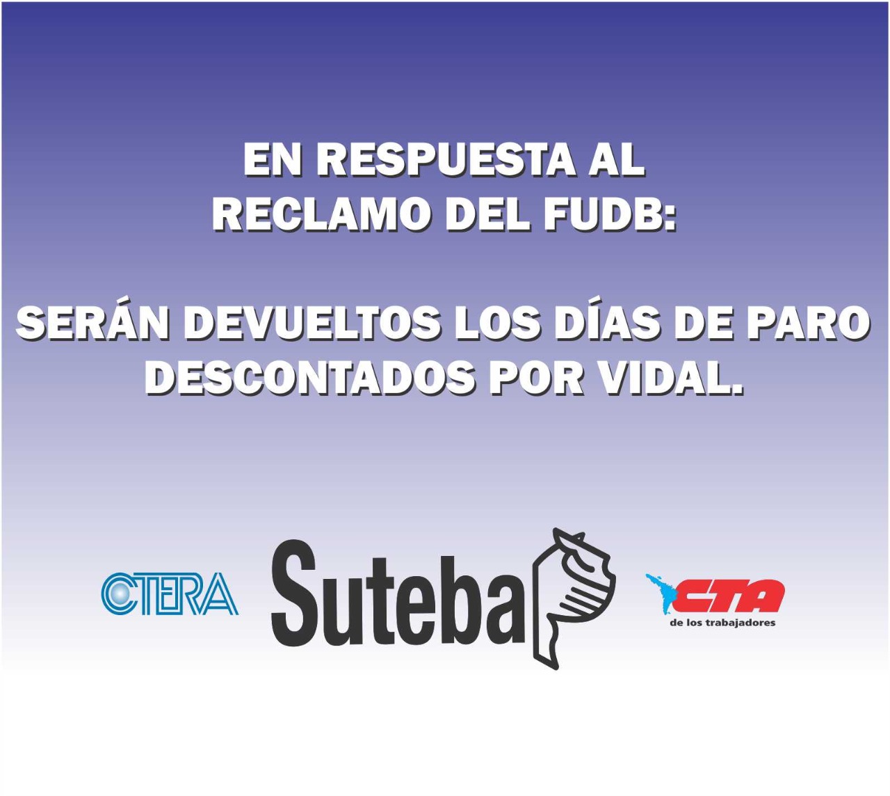 Luego de la presentación de la nota que realizó el Frente de Unidad Docente Bonaerense el viernes 10 de enero, en reclamo por la devolución de los días de Paro en solidaridad con lxs Docentes de Chubut; la Dirección General de Cultura y Educación resolvió el reintegro de dichos Paros de noviembre, que habían sido descontados en el cobro de diciembre por el gobierno de la ex Gobernadora Vidal.