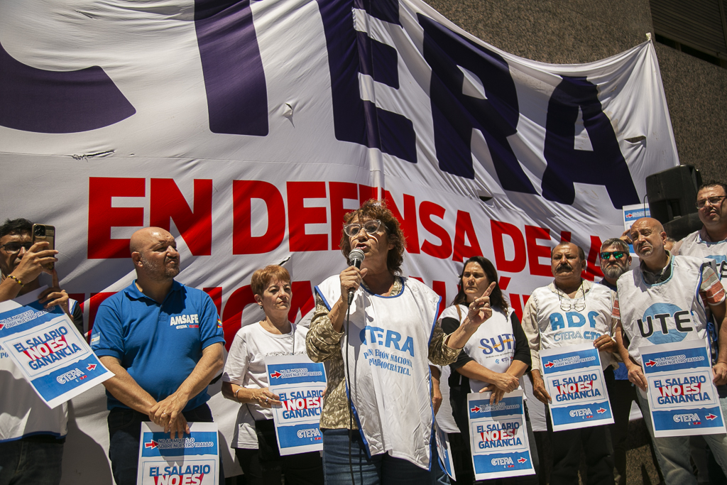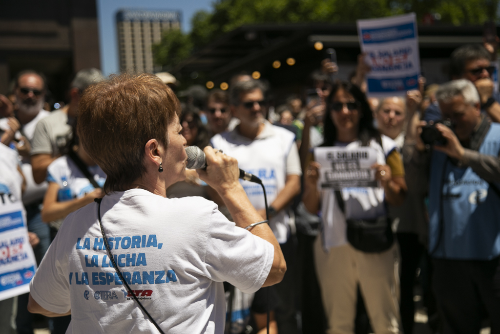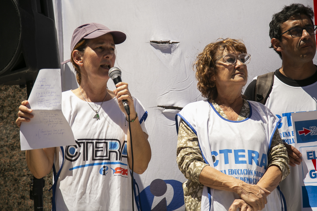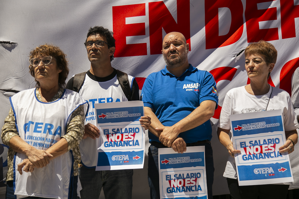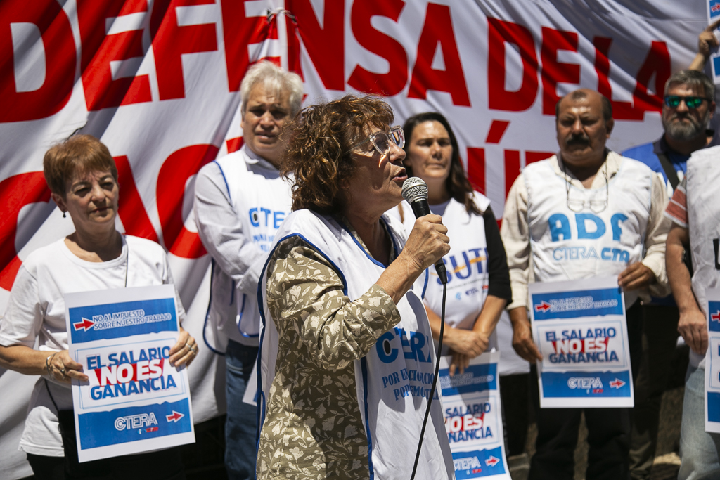 Asimismo, Almazán expresó: "Estamos presentes en esta jornada de lucha de CTERA porque, una vez más, el Gobierno Nacional nos expropia el salario. Por un lado, no paga el FONID desde hace muchos meses, lo que nos empobrece, y ahora nos obliga a pagar el Impuesto a las Ganancias. Exigimos que respeten nuestro salario".