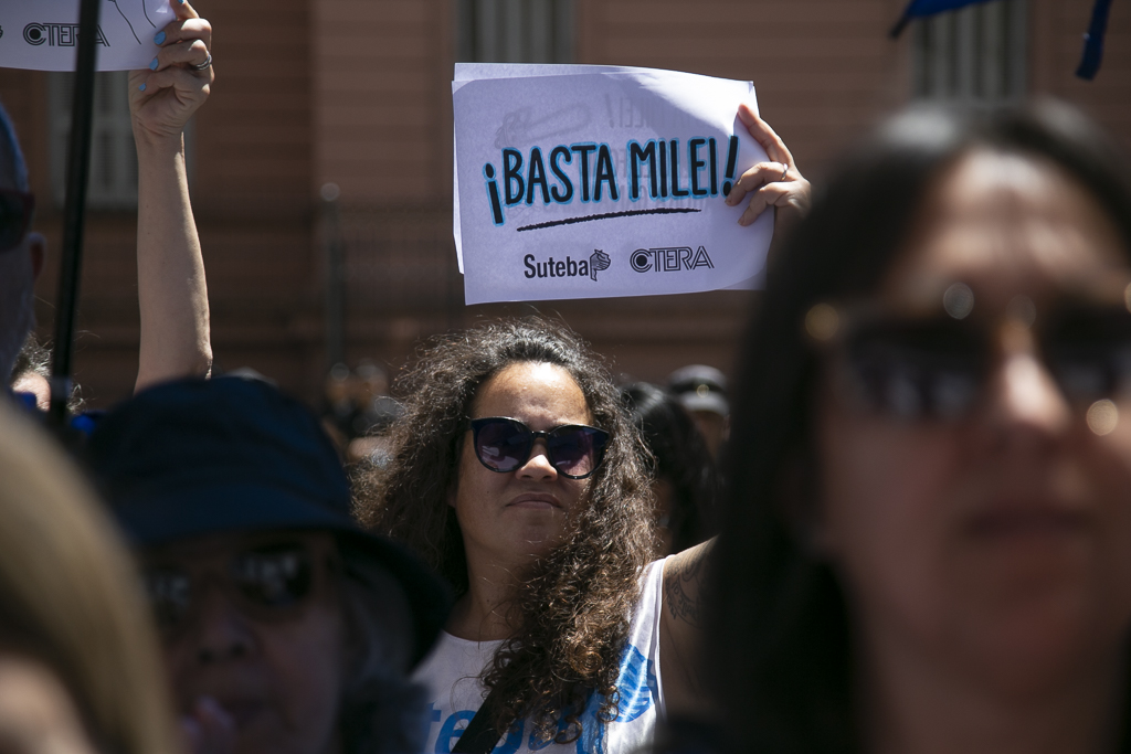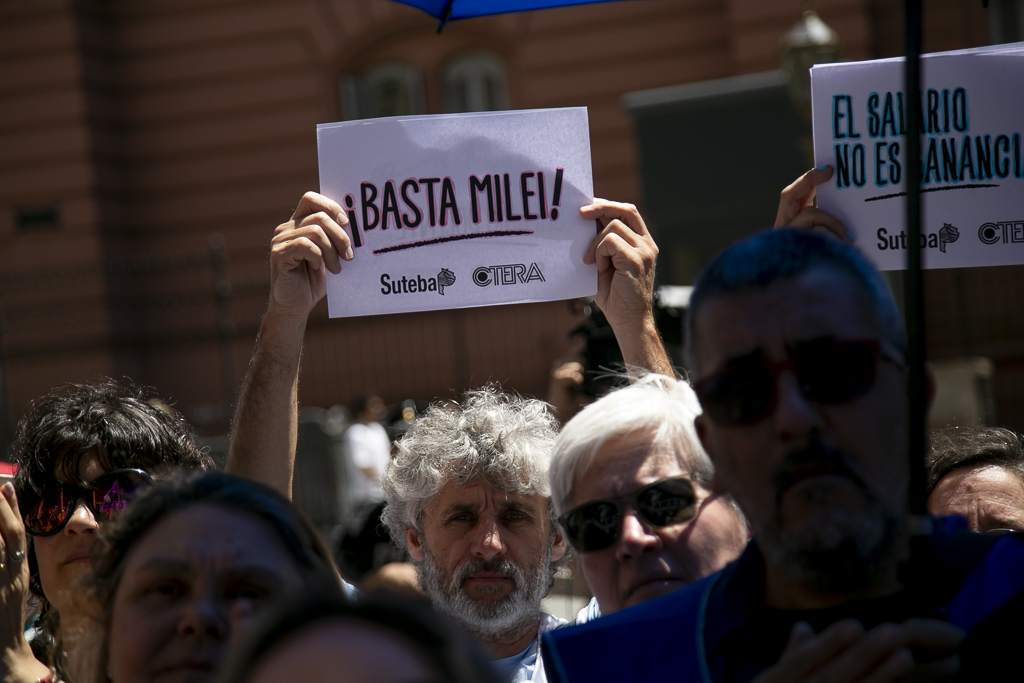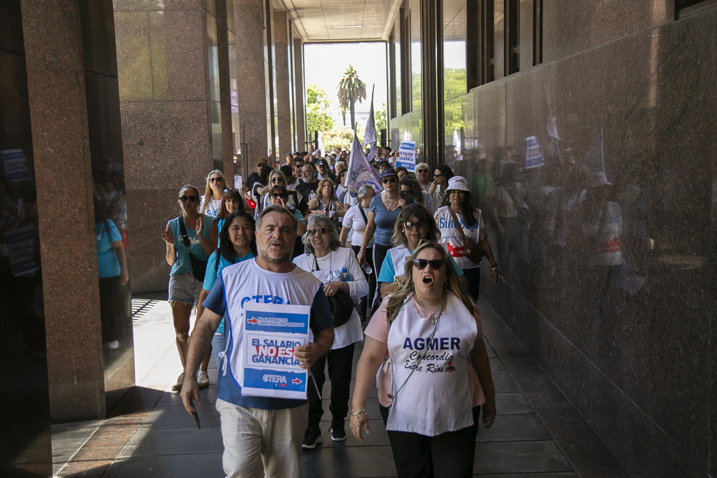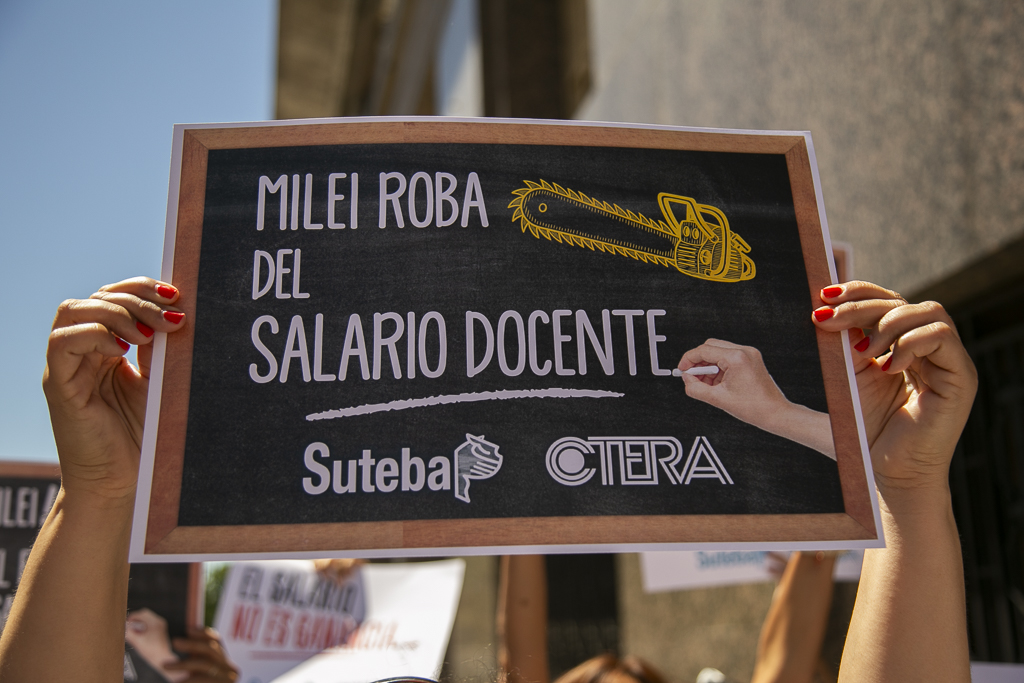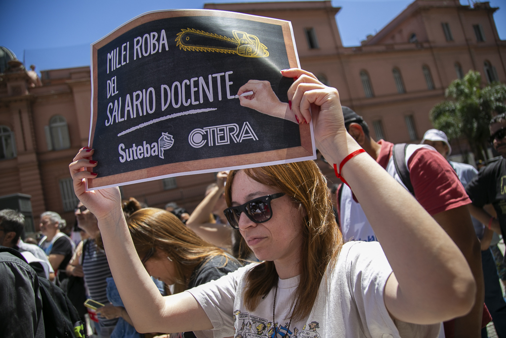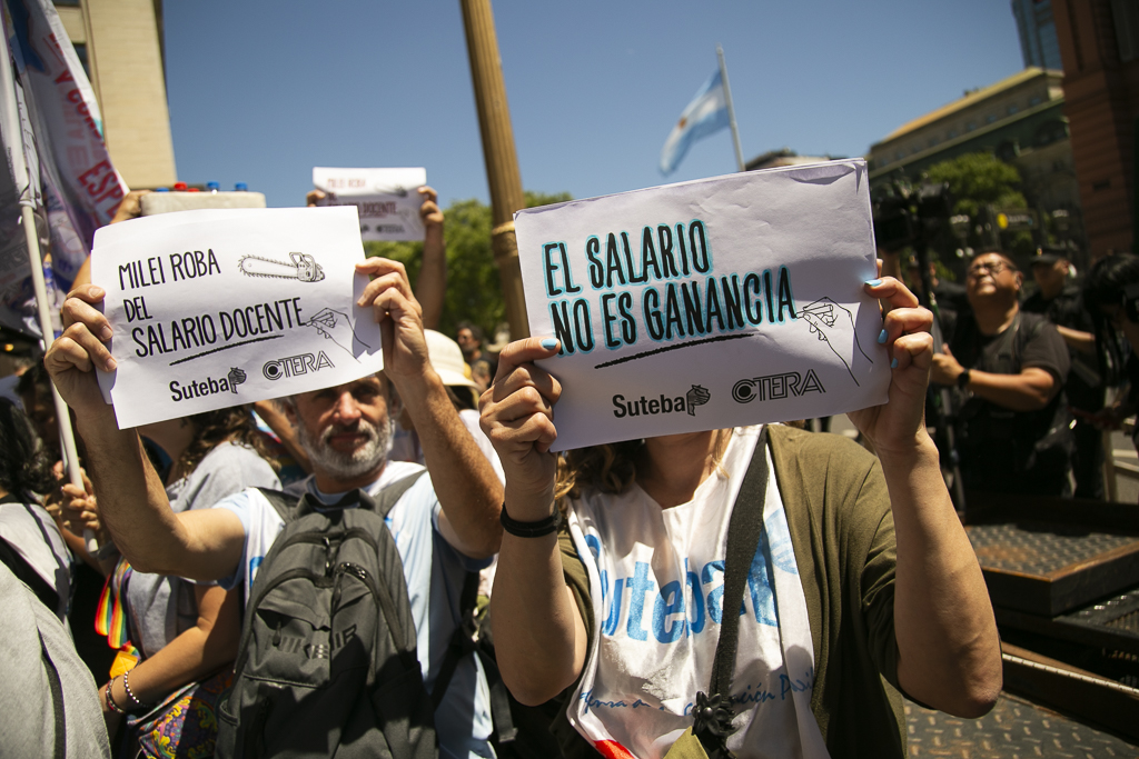 Asimismo, Almazán expresó: "Estamos presentes en esta jornada de lucha de CTERA porque, una vez más, el Gobierno Nacional nos expropia el salario. Por un lado, no paga el FONID desde hace muchos meses, lo que nos empobrece, y ahora nos obliga a pagar el Impuesto a las Ganancias. Exigimos que respeten nuestro salario".