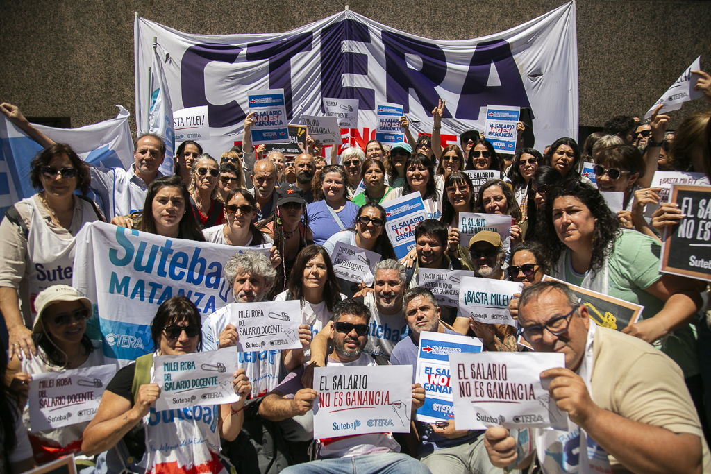 El SUTEBA participó esta mañana de la concentración frente al Ministerio de Economía, convocada por la CTERA para repudiar la medida judicial que restituye el pago del Impuesto a las Ganancias para lxs Docentes, dictamen que responde a las políticas de ajuste del Gobierno Nacional.