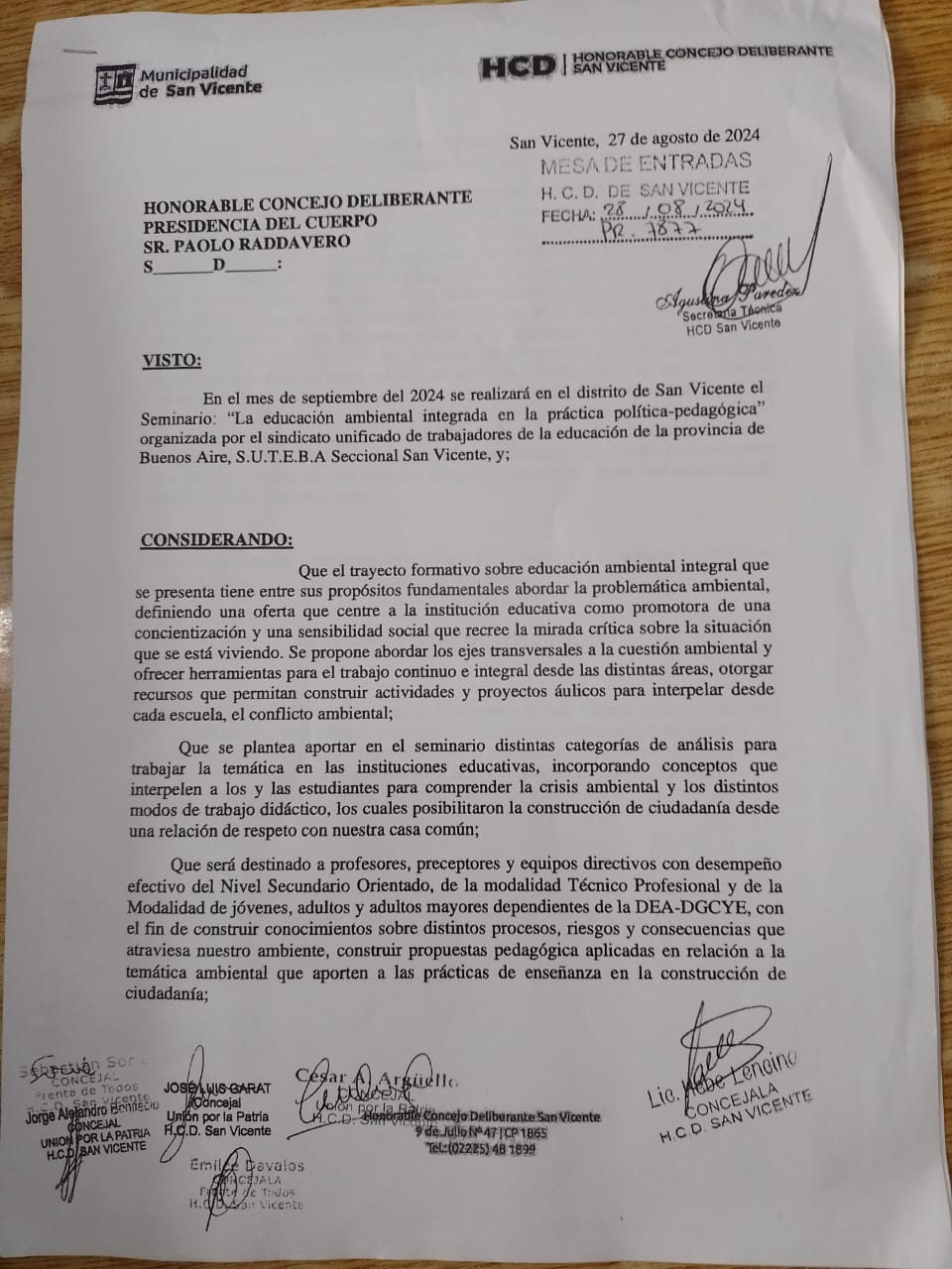 En el día de hoy, el HCD de San Vicente aprobó por unanimidad el Proyecto de Resolución Nº 7877/24 que declara de interés social, educativo y ambiental al Seminario de nuestra Organización Sindical "La Educación Ambiental integrada en la práctica político pedagógica".
