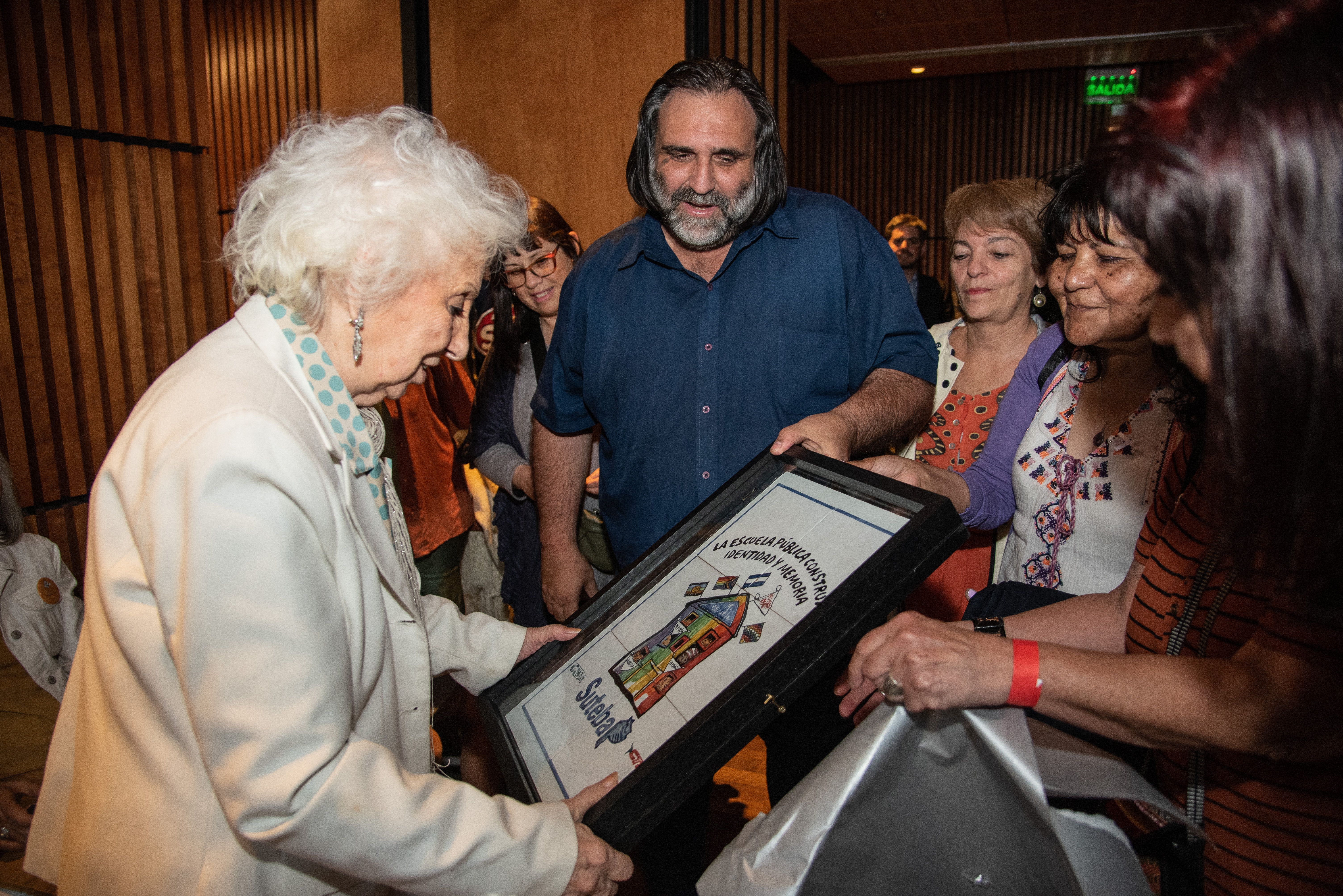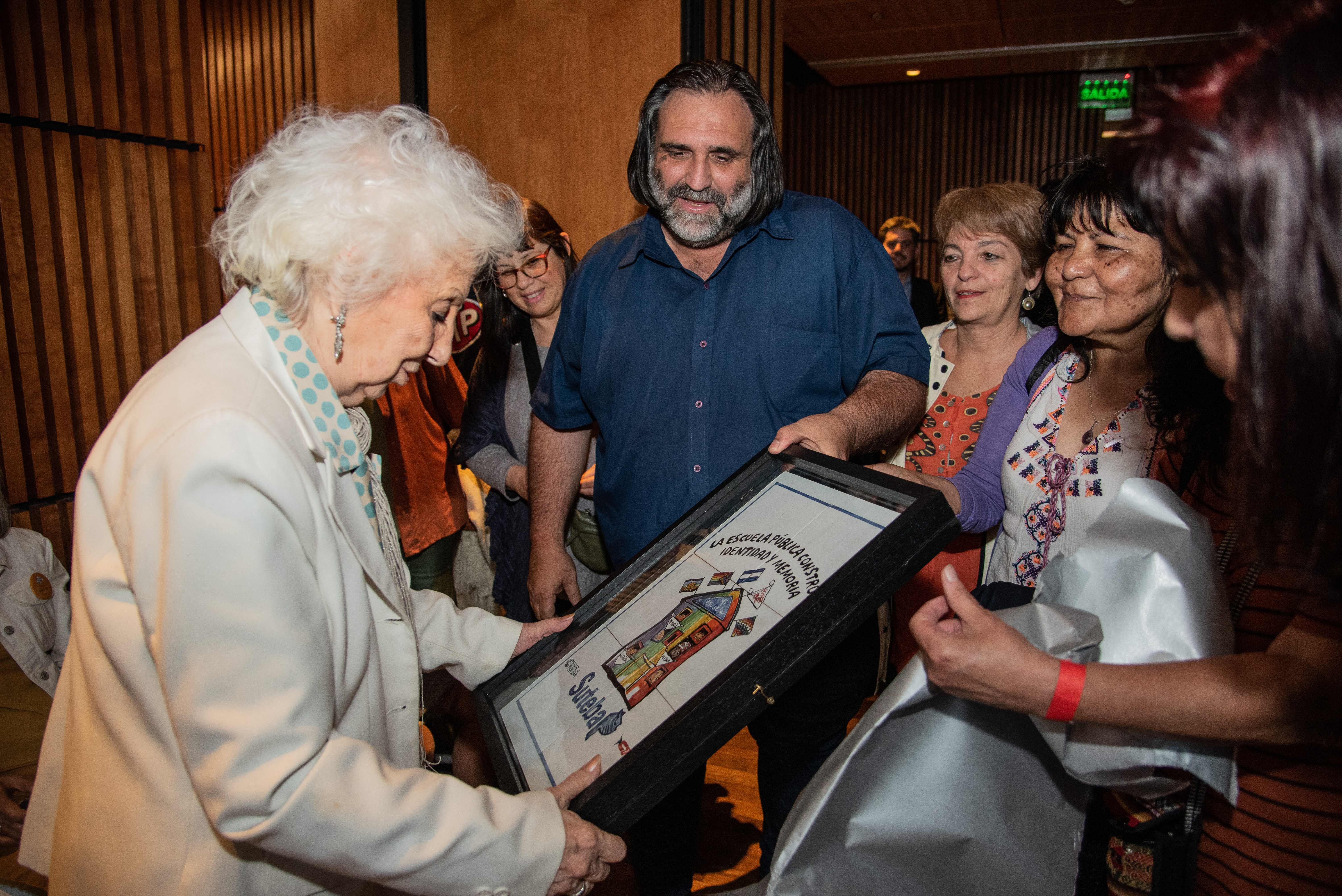 Momentos antes de que se inicie el acto, quienes integrábamos la delegación del SUTEBA, estuvimos con Estela y las Abuelas y les entregamos un cuadro:ç, unos mosaicos que conforman una Escuela, con la bandera de los Pueblos Originarios, la de la Argentina y la del movimiento LGBTTTIQNB+, como símbolo de la Escuela Pública inclusiva, constructora y respetuosa de las identidades; obsequio que Estela recibió con alegría y emoción.