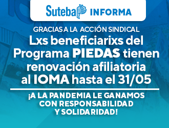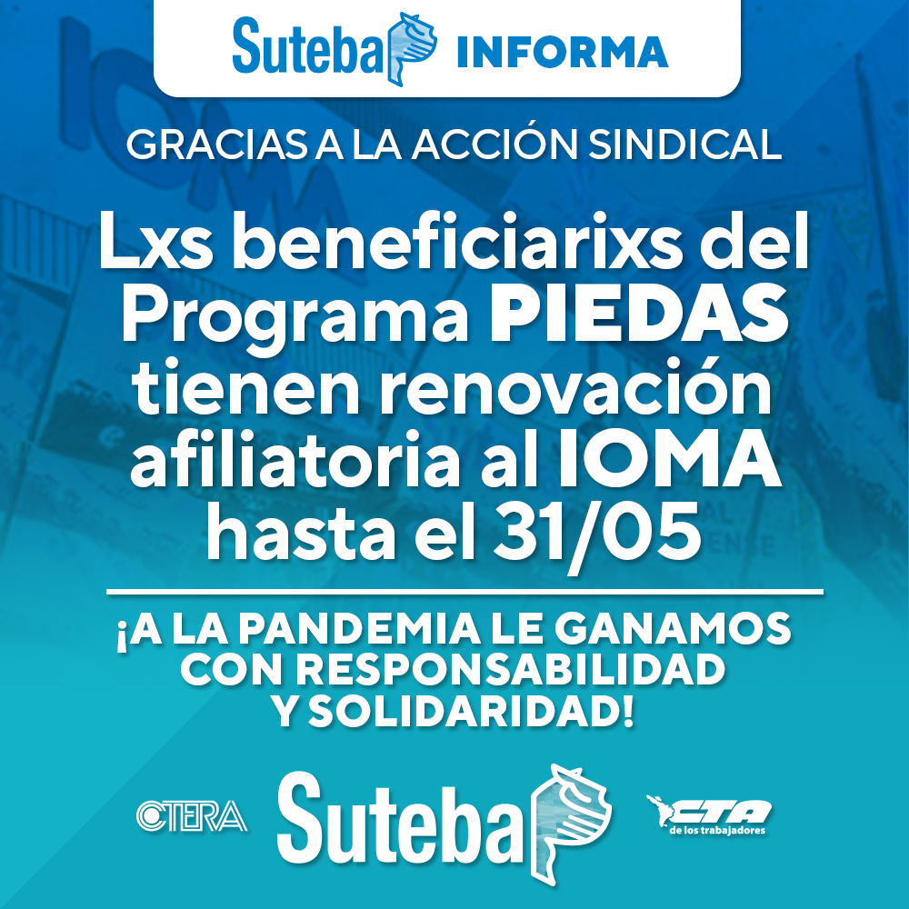 Ante las acciones de nuestra Organización Sindical, en conjunto con el Frente de Unidad Docente Bonaerense, el IOMA informó que a lxs beneficiarixs del Programa PIEDAS, que contempla suplencias y Plan Fines, se les renovará la afiliación a la Obra Social hasta el 31 de mayo próximo.