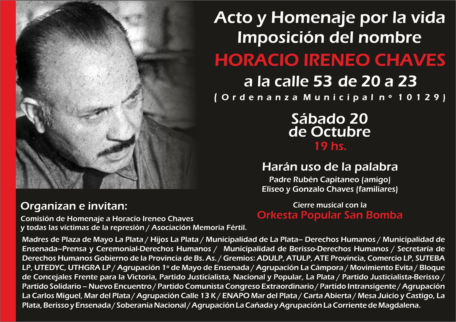 El tramo de la avenida 53 que va desde la calle 20 a 23 ya lleva el nombre de Horacio Irineo Chaves, emblema de la Resistencia Peronista, asesinado por la Triple A en 1974, y que en 1956, como parte del movimiento de militares vinculado a Perón había participado en la toma del Regimiento 7 de La Plata.