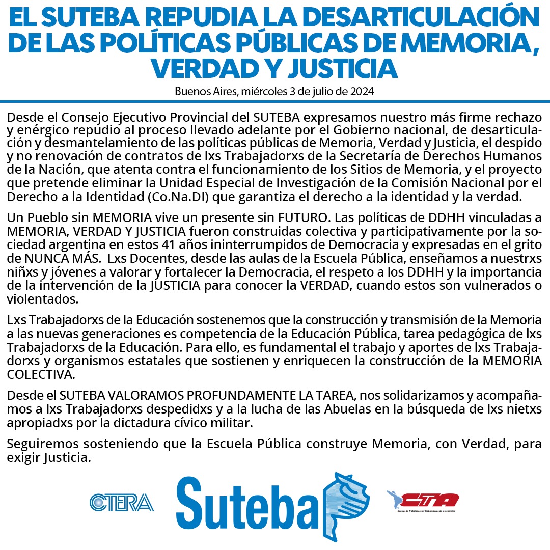 Desde el Consejo Ejecutivo Provincial del SUTEBA expresamos nuestro más firme rechazo y enérgico repudio al proceso llevado adelante por el Gobierno nacional, de desarticulación y desmantelamiento de las políticas públicas de Memoria, Verdad y Justicia, el despido y no renovación de contratos de lxs Trabajadorxs de la Secretaría de Derechos Humanos de la Nación, que atenta contra el funcionamiento de los Sitios de Memoria, y el proyecto que pretende eliminar la Unidad Especial de Investigación de la Comisión Nacional por el Derecho a la Identidad (Co.Na.DI) que garantiza el derecho a la identidad y la verdad.